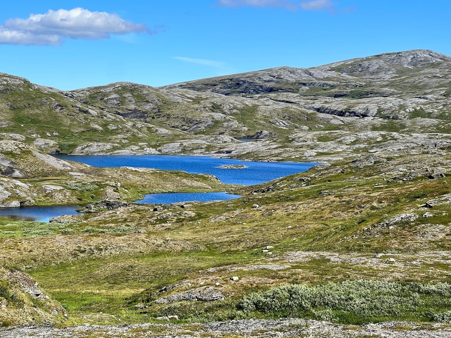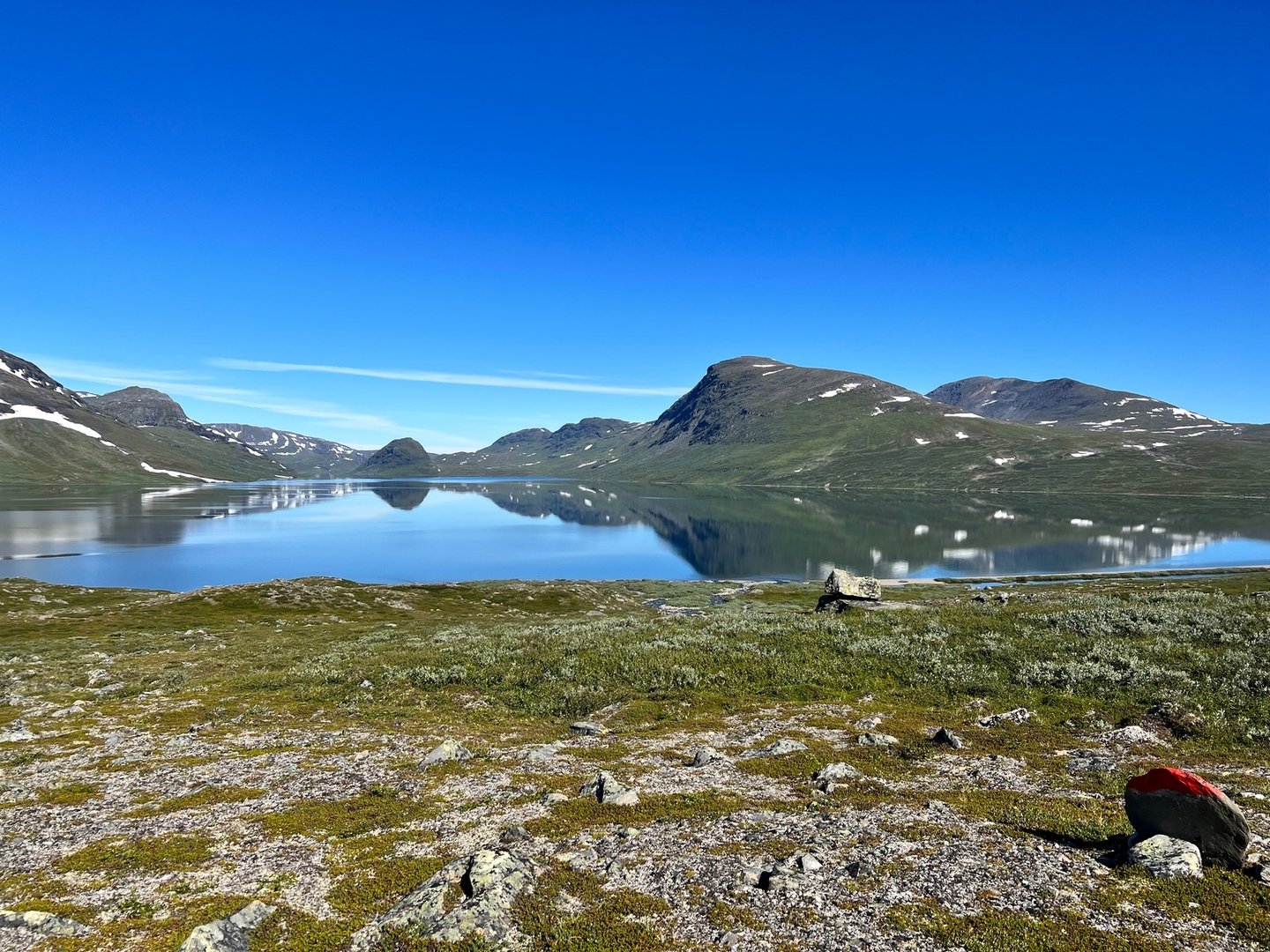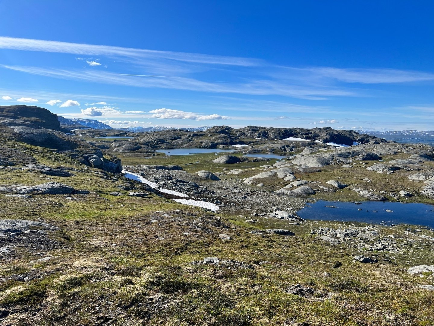 Ich folge einem Pfad, der in ost-südöstlicher Richtung aus dem Samidörfchen hinausführt. Weiss nicht, ob ich was falsch gemacht habe oder nicht aber schon nach ein paar Kilometern wird das teilweise zu einer ziemlichen Kletterei. Bleibe in gutem Abstand nord-nord-westlich der größeren Seen, bis ich mich dann doch entschließe einfach quer zwischen den Seen, südlich des Njallajávrásj Richtung Unna Liemak zu laufen, den ich an seinem Nordhang passiere. Mein Ziel ist der Álájávrre. Kurz davor steht eine Renvaktarhütte, die ist aber verschlossen. Ich folge dem See auf seiner Nordseite. Das ist zuweilen recht mühsam. Und eintönig. Kurz vorm Nuortap Rissávarré habe ich keine Bock mehr und baue bei Wind und Sonnenschein das Zelt auf. Morgen ist auch noch ein Tag!