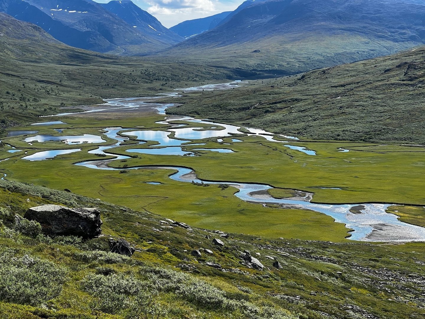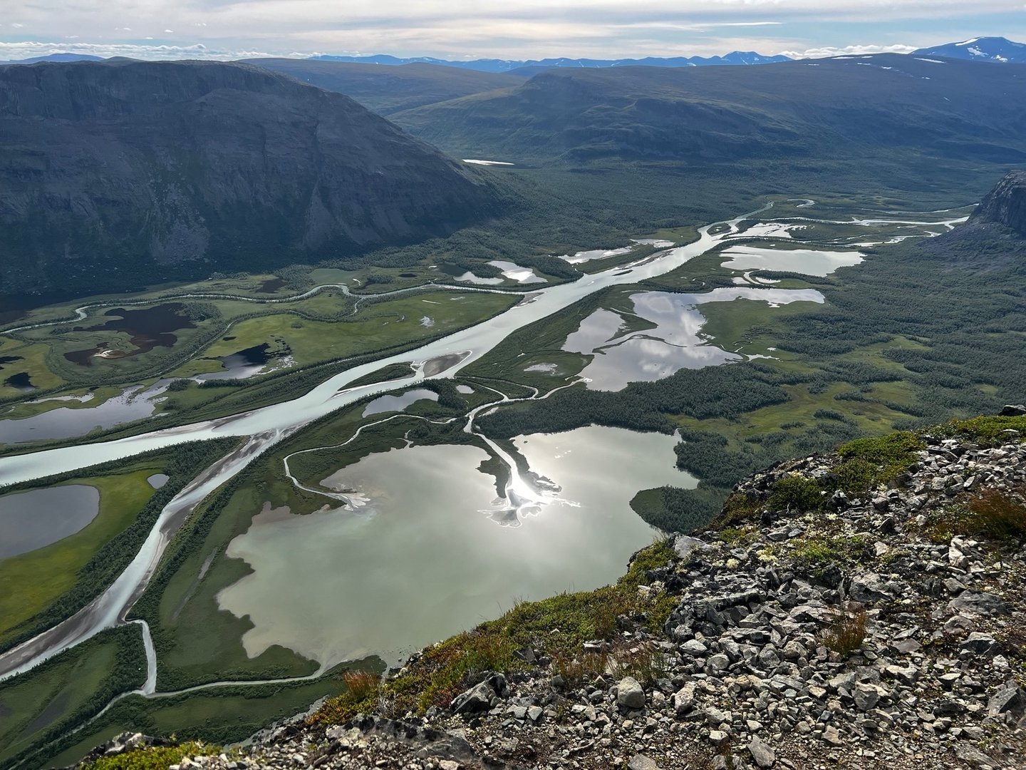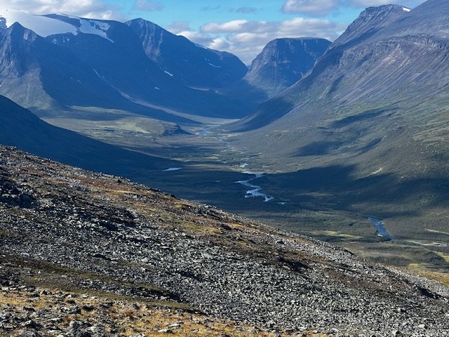 Als ich am nächsten Morgen beim Frühstück sitze, spaziert er freudestrahlend durch die Tür, nimmt mir Geld für die Übernachtung ab und erklärt mir, dass er gezwungen war, die Nacht draussen zu verbringen „ohne Zelt“, weil es irgendwie zu spät und das Wetter zu schlecht wurde. Hört sich für mich irgendwie recht wild an und ich hab auch immer noch nicht verstanden, wo er eigentlich seinen Sohn besucht hat. Egal. Ich erkläre, dass ich heute weiter ins Kaskasavagge will, aber mir über die Route noch im Unklaren bin. Er rät mir von der nordwestlichen Route ab, weil es da wohl eine Kletterpassage gäbe, die ohne entsprechende Ausrüstung nicht ratsam wäre. Ich mache mich also auf den Weg zurück und drehe dann Richtung Ost-Südost ab. Da ist zwar ein Weg auf der Karte eingezeichnet, den finde ich aber nicht, bzw finde mal hin und wieder was, nur um ihn dann direkt wieder zu verlieren. Insgesamt eine ziemliche Kletterei, ich bin vermutlich ein bisschen zu weit südlich. Oben angekommen erhasche ich einen fantastischen Blick auf den Kebnekaise und die angeschlossenen Gletscher. Bzw halt das was von denen noch übrig ist. Irgendwie auch sehr traurig. Der Wind frischt auf und nach der ganzen Kraxelei wird mir ziemlich schnell verdammt kalt. Ich beschließe einfach die Daunenjacke über die Regenjacke zu ziehen und siehe da, das funktioniert prima. Über großes Geröll geht es weiter, bis aus dem Geröll regelrechte Felsblöcke werden, ich „klettere“ (oder stolpere) auf der östlichen Seite des eigentlichen Darfalglaciär weiter gen Norden. Mühsam, mühsam. Irgendwann schaffe ich es aber doch bis zum Kaskasavagge und der dortigen Schutzhütte. Im Windschatten der Hütte, aber in der Sonne mache ich Mittagspause. Herrlich! Irgendwie war ich mir ziemlich sicher, dass es von hier an viel leichter zu wandern wäre, dass es ab hier wieder einen richtigen Wanderweg Richtung Vistasvagge gäbe. So war es aber nicht, es blieb steinig. Zumindest überwiegend. Ich schaffe es bis zum Visttasjohka, treffe kurz vor der Brücke auf einen seltsamen Typen in neonfarbener Schutzkleidung, den ich nicht verstehe, der aber auch keine Zeit hat für lange Gespräche und Erklärungen und dann einfach weiterläuft. Ich quere und folge dem Trail nordwärts, bis ich einen wunderschönen Zeltplatz an einer Flussschlinge finde. Der erste bin ich hier nicht, davon zeugt ein ganzer Berg verrosteter Dosen, Glasflaschen und Gaskanister. Ich gehe in der Abendsonne baden. Eine Angel wäre jetzt nicht schlecht!