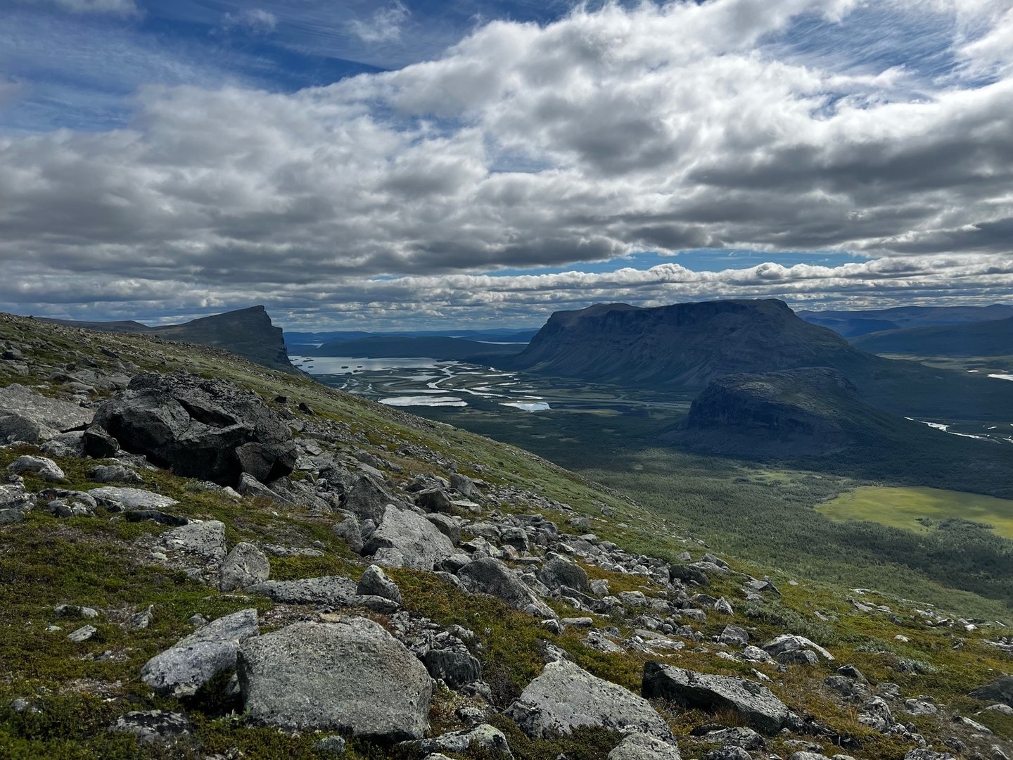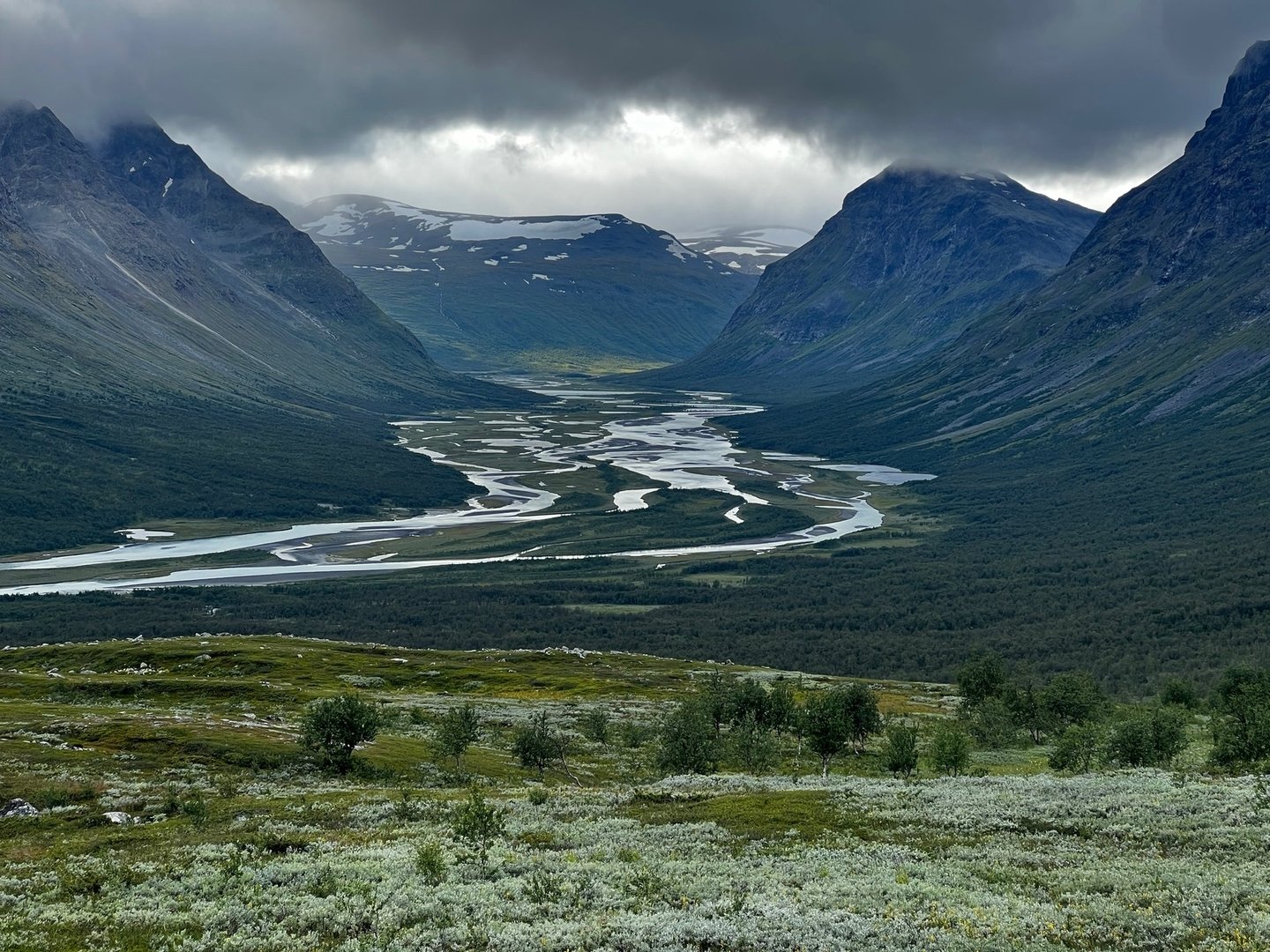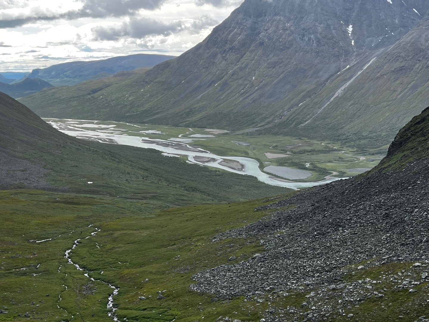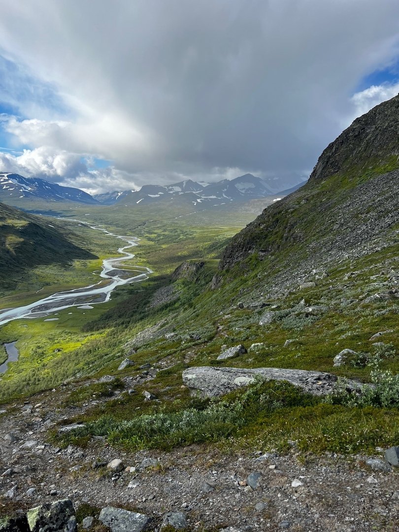 Der Weg entlang des Tals ist wirklich sehr gut, die Flussquerungen sind auch easy und schon bald lasse ich das Sarekmassiv hinter mir und erreiche Skárjá. Ich treffe ein paar Wanderer, die wohl aus dem Basstavágge kommen. So langsam bekomme ich ein mulmiges Gefühl, weil ich auf der Karte sehe, wie steil es bald werden wird und aus der Ferne gefällt mir gar nicht, was ich sehe. Ich bin auf dem Weg Richtung Snávvávágge. Hinter mir braut sich ein Unwetter zusammen. Der Wind frischt auf und eine Regenwand rollt auf mich zu. Na toll! Die steile Stelle ist tatsächlich recht steil, konkret ist ein recht überwachsener Steilhang zu passieren. Das ganze bei Regen zu machen wäre sicher kein allzu freudiges Ereignis, also lege ich noch einen Zahn zu. Hätte ich mal vorher bloß nicht so viel getrödelt! Trotzdem bin ich auf der Suche nach dem spöksten, der auf der Karte eingezeichnet ist und bei dem ich zu Hause schon die Legend darum nachgelesen habe. Schließlich entdecke ich ihn auch. Oben an der Hochebene angekommen, begegnen mir zwei Typen, die in anderer Richtung unterwegs sind. Sie wollen noch „bis runter“. Ich deute auf die Regenwand aber die lassen sich nicht beirren. Nicht mein Problem! Ich treffe auf eine Mutter und ihren kleinen Sohn. Die haben sich den besten Platz da oben geschnappt, die einzig wirklich windgeschützte Stelle weit und breit. Na gut, ich werd‘s wohl hoffentlich überleben und schlage heldenhaft mein Zelt ein paar hundert Meter weiter direkt am See auf.