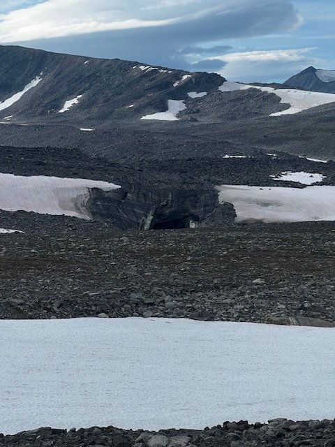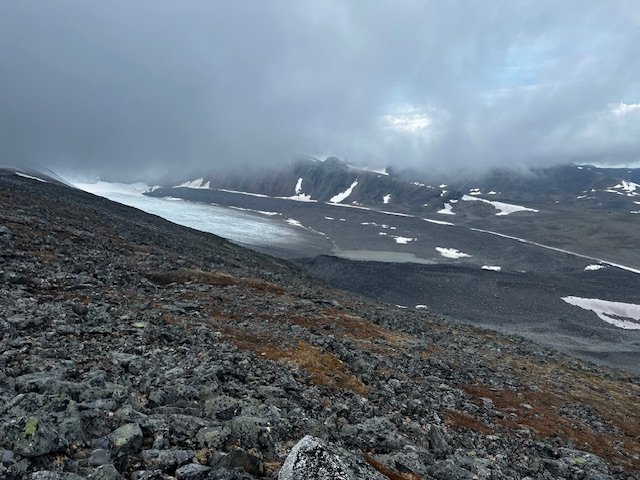 Am nächsten Tag mache ich erstmal kurz an der Vistas-Hütte halt und sage Hallo. Der Plan für heute ist es, es über den Mårmapass zu schaffen. Die Strecke kenne ich eigentlich, ich bin sie vor ein paar Jahren schon Mal gegangen. Nur in anderer Richtung. Damals von Abisko kommend via Lapporten und dann von der Vistastuga weiter Richtung Nallo. Jetzt eben anders rum. Ich hab noch dunkel in Erinnerung, dass das alles kein Zuckerschlecken war. Ich brauche eine gefühlte Ewigkeit bis ich endlich kurz vorm Pass stehe. Die Felsblöcke hier sind gigantisch groß, die Größe von SUVs oder kleinen Panzern. Man fühlt sich wie eine Ameise. So hatte ich das absolut nicht in Erinnerung. Bin ich hier überhaupt richtig? Nach einer Weile realisiere ich, dass ich damals wohl etwas weiter östlich gegangen bin. Und es hatte sehr viel Nebel. Oben am Pass treffe ich auf ein paar Leute, die mich eindringlich warnen, wie steil doch der Pass wäre. Ich frage mich, was die denken, wozu solche Warnungen gut sein sollen. Wie dem auch sei, diesmal ohne Nebel erhasche ich einen guten Blick auf den Mårma-Gletscher. Dieser ist ja auch Teil einer großangelegten Forschungsstudie, ausgehend von der Tarfalla-Forschungsstation und von daher ein bisschen berühmt. Der Anblick ist erschütternd. Ein paar Stunden später bin ich unten an der Hütte. Die wird gerade renoviert, aber irgendwer hat es geschafft, das neue Fenster schon wieder zu zerbrechen. Im Holzschuppen findet sich statt Holz nur ein großer Berg an Müll. Danke! Hier wollte ich ohnehin nicht bleiben, aber fragen tut man sich schon, wo die Leute so ihr Hirn haben, so sie denn überhaupt eines haben. Ich watschle noch ein paar Kilometer weiter, treffe auf drei Deutsche, die gerade dabei sind, ihr hübsches Tunnelzelt aufzubauen, und irgendwie habe ich - wohl davon inspiriert - nach ein paar Schritten auch plötzlich absolut keine Lust mehr noch weiter zu laufen.