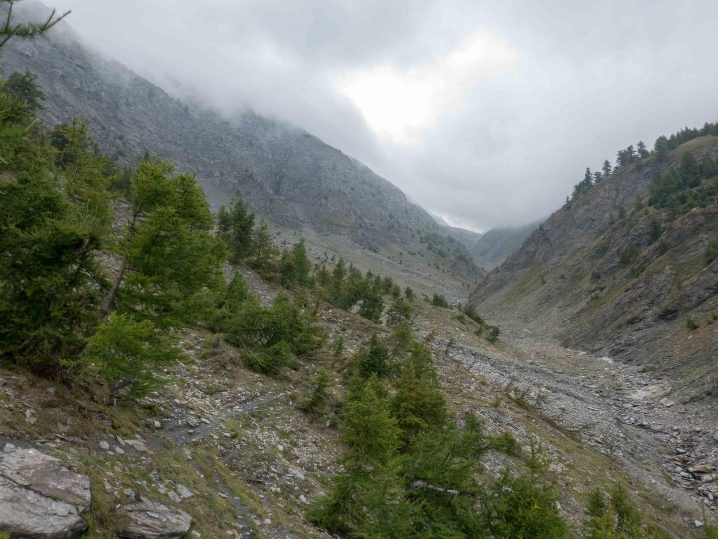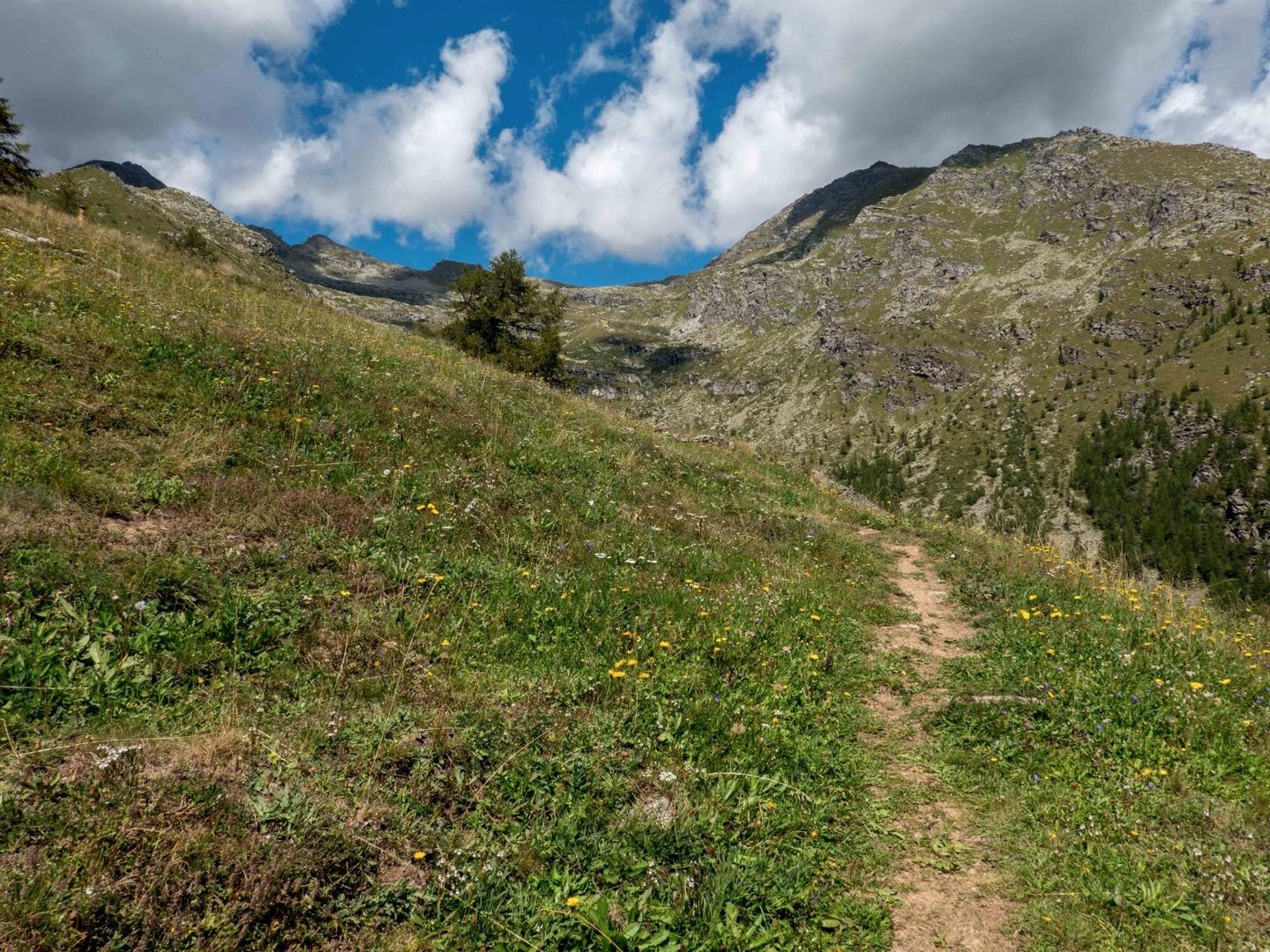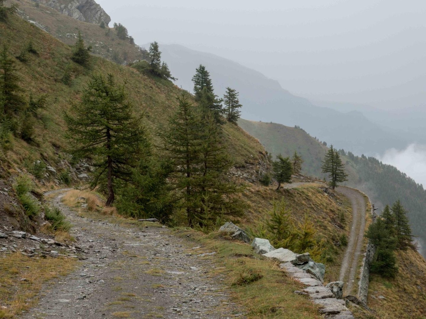 Als wir endlich unten im Tal ankamen und zurückblickten, hatte der Himmel bedrohlich zugezogen. Ein echt imposanter Anblick! Von hier wars nicht mehr weit zum mondänen Albergo Rocciamelone, wo wir ein Gelati und Panache genossen. Eher spät verabschiedete ich mich von Ch., welcher sich hier auf den Heimweg machte und zog weiter. Ich hatte keine Ahnung wohin mich der Weg heute noch führen würde. Eins war aber klar! Ich wollte auf der Decauville zum Rif Vulpot gelangen. Die Decuaville Malciaussia ist eine verlassene Bahnstrecke. Mit der Bahn wurden um 1932 rum Baumaterial zur Baustelle des Malciaussia-Staudamms transportiert. Ab und an sind die Gleise noch sichtbar.