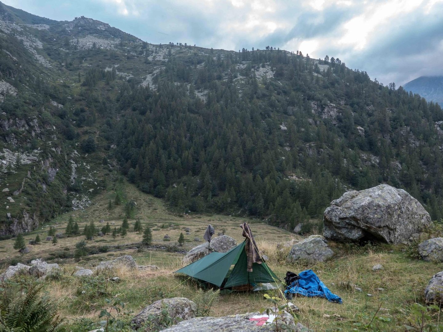 Bei der Alpe Trione, welche offenbar nicht mehr bestossen wird, finde ich um 19:00 Uhr herum einen 1A Übernachtungsplatz. Ich koche mir ein feines Abendessen und geniesse die schöne Abendstimmung und die Ruhe. Einfach schön!