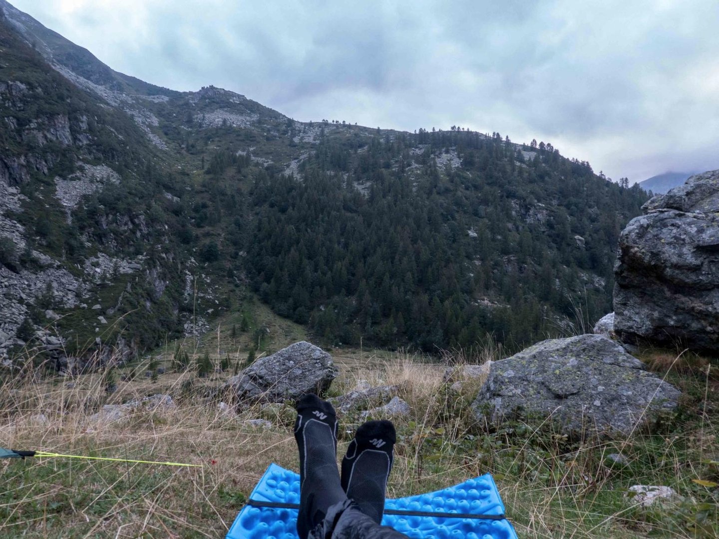 Natürlich waren die Schuhe triefnass, aber die trocknen schon wieder. Beim Biv. angekommen versuchte ich den Kram einigermassen zu trocknen. Naja war eher ein untauglicher Versuch. Es bleib zwar trocken, aber die Sonne vermochte sich heute nicht mehr durchzusetzen. Das tat meiner guten Laune jedoch keinen Abbruch und ich genoss die schöne Abendstimmung. In meinem Dusel schaffte ich es jedoch wiedermal mir meinen Fuss (ich laufe am Abend gerne barfuss) an einem Stein „aufzuschlitzen“. Naja, für das habe ich ja Pflaster dabei.