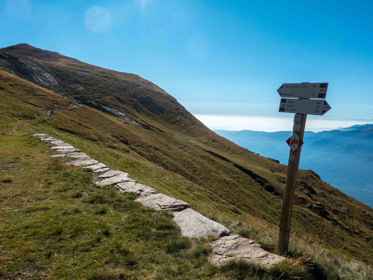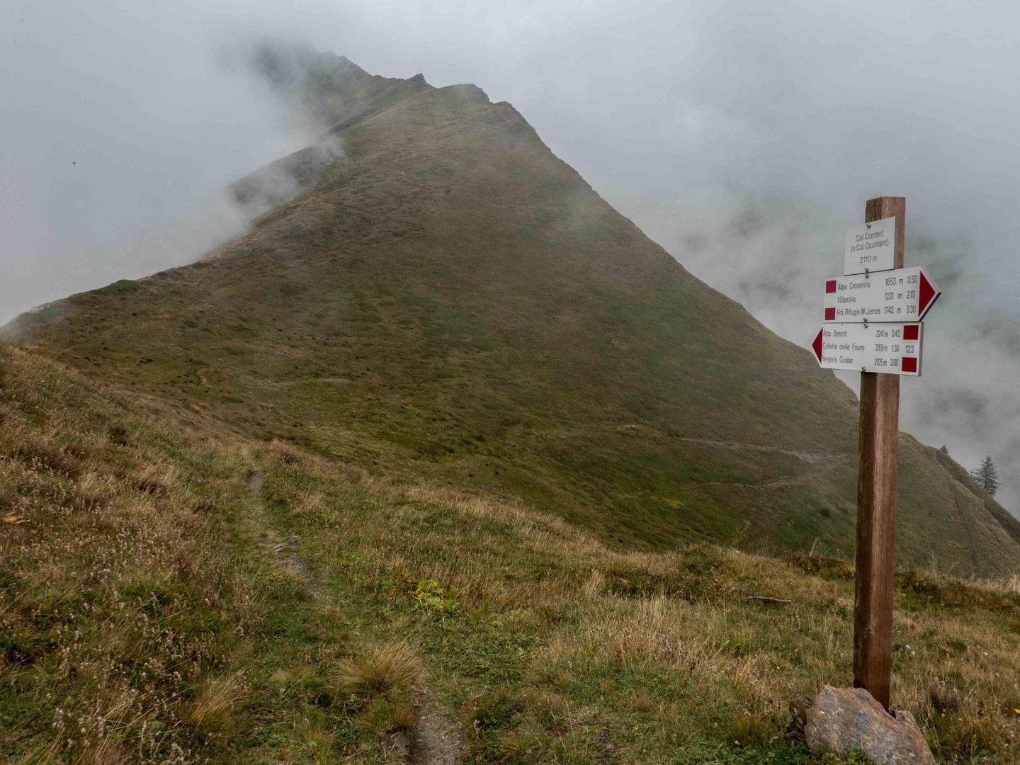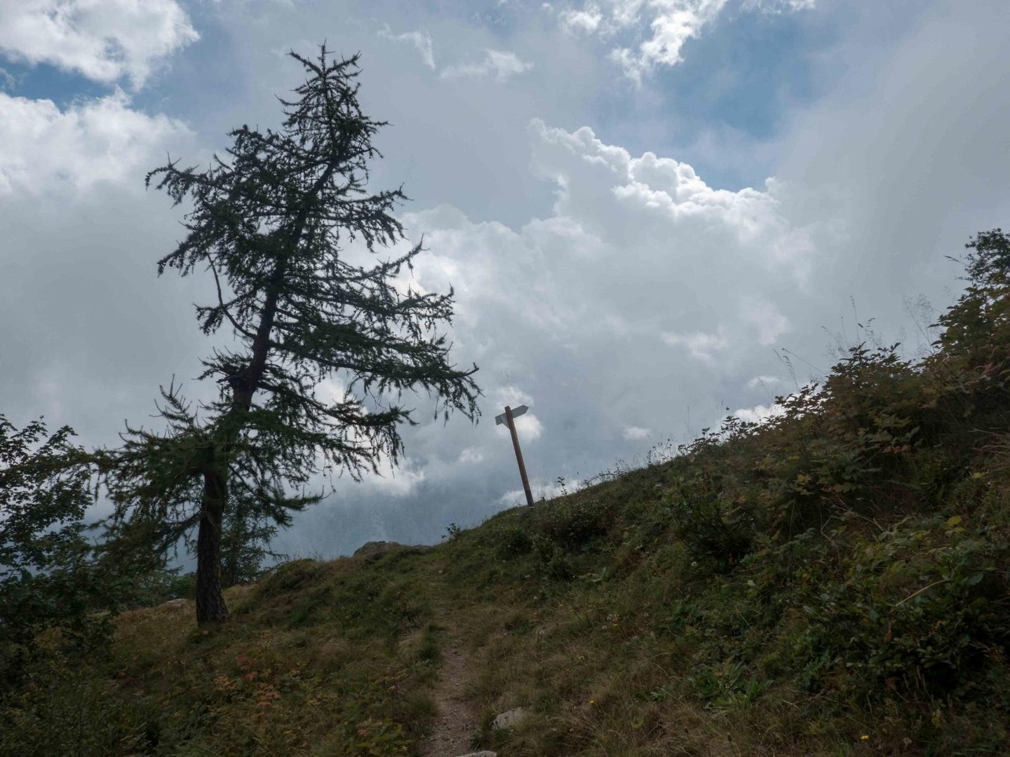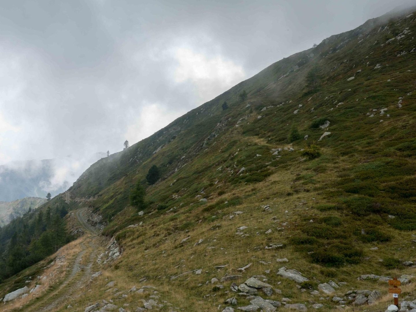 Da mich der Weg der Passstrasse nicht sonderlich reizte, studierte ich an der Variante rum. Der Rother schreibt „Ist aber nur etwas für Experimentierfreudige“. Naja meine Experimentierfreudigkeit hat nach dem einen oder anderen Erlebnis mit der Wegführung hier etwas nachgelassen. Die Lust auf einen kleinen alpinen Abstecher überwiegt dann aber und der Weg ist für meinen Geschmack einfach und gut signalisiert. Die Beschreibung im Rother empfand ich als unverständlich. Die beschriebene Baita Parvo, 1958 müM. fand ich nirgends. Dafür etwas weiter oben ein Wegweiser bei der Località Langra, 1971 müM. Von da weg gewinne ich schnell an Höhe und blicke alsbald auf die Passstrasse.