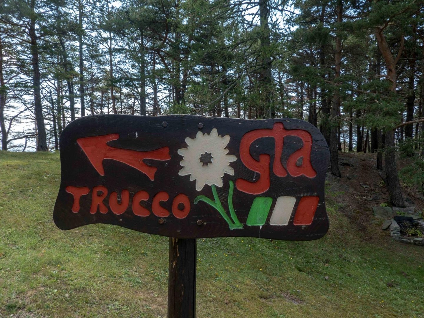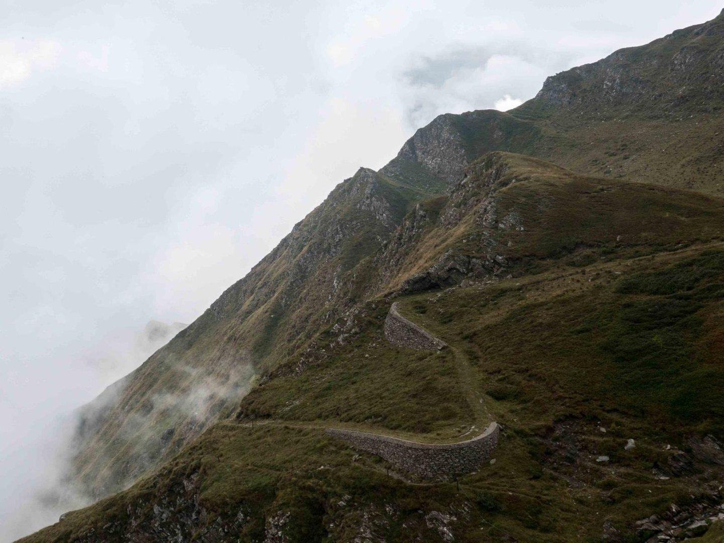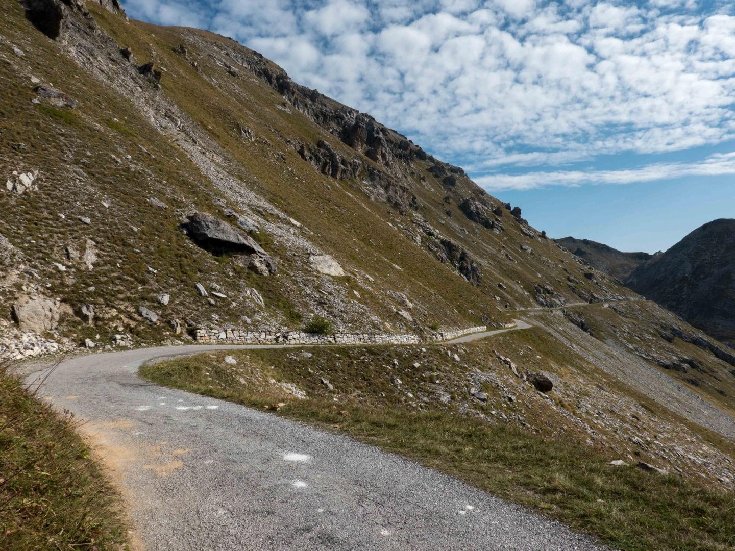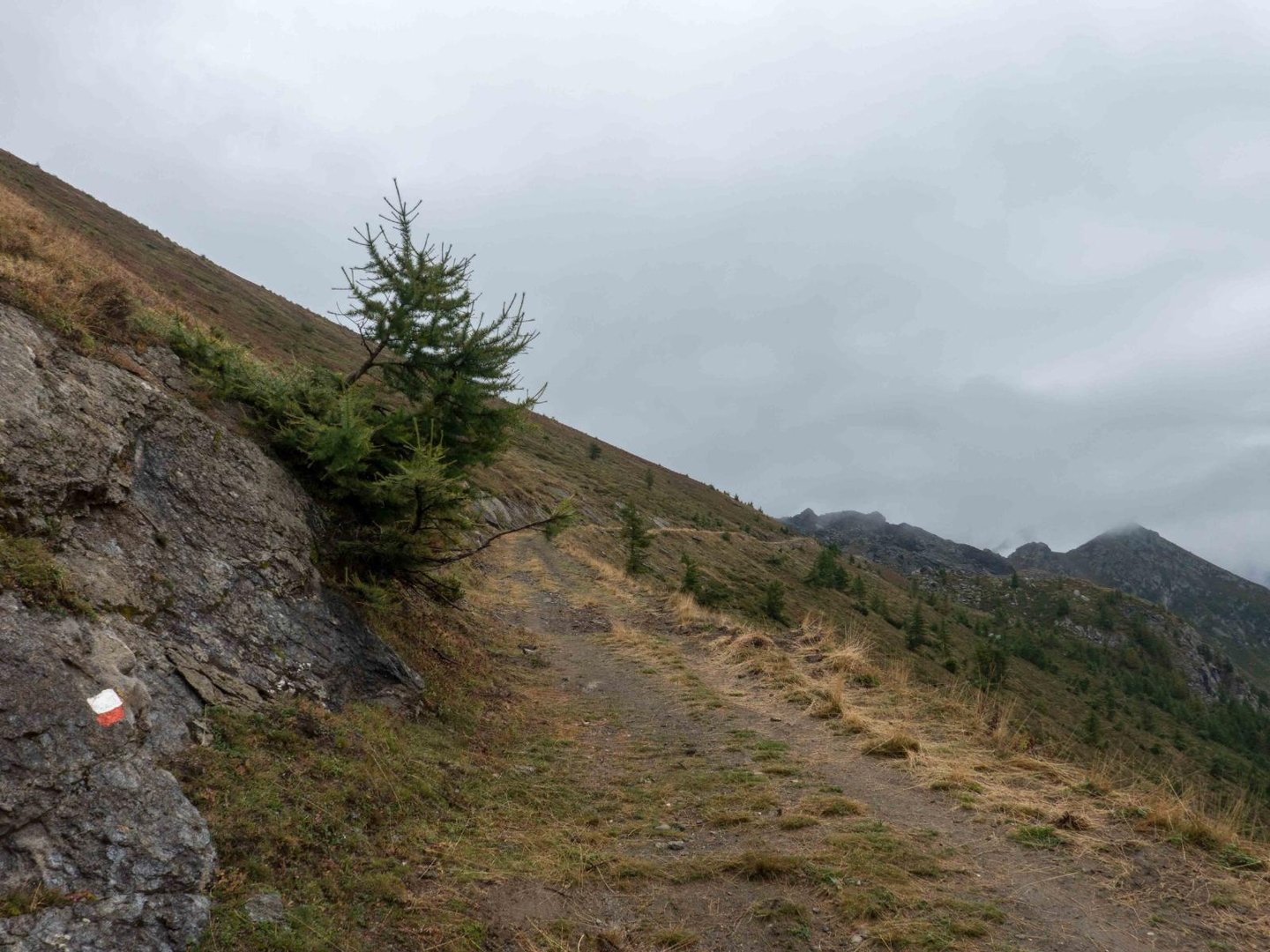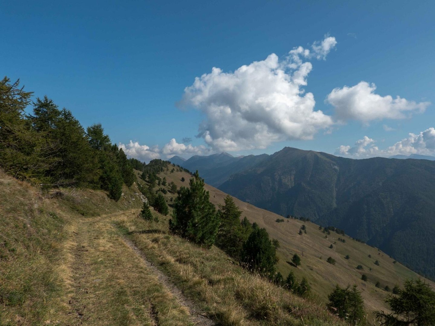 Da mich der Weg der Passstrasse nicht sonderlich reizte, studierte ich an der Variante rum. Der Rother schreibt „Ist aber nur etwas für Experimentierfreudige“. Naja meine Experimentierfreudigkeit hat nach dem einen oder anderen Erlebnis mit der Wegführung hier etwas nachgelassen. Die Lust auf einen kleinen alpinen Abstecher überwiegt dann aber und der Weg ist für meinen Geschmack einfach und gut signalisiert. Die Beschreibung im Rother empfand ich als unverständlich. Die beschriebene Baita Parvo, 1958 müM. fand ich nirgends. Dafür etwas weiter oben ein Wegweiser bei der Località Langra, 1971 müM. Von da weg gewinne ich schnell an Höhe und blicke alsbald auf die Passstrasse.
