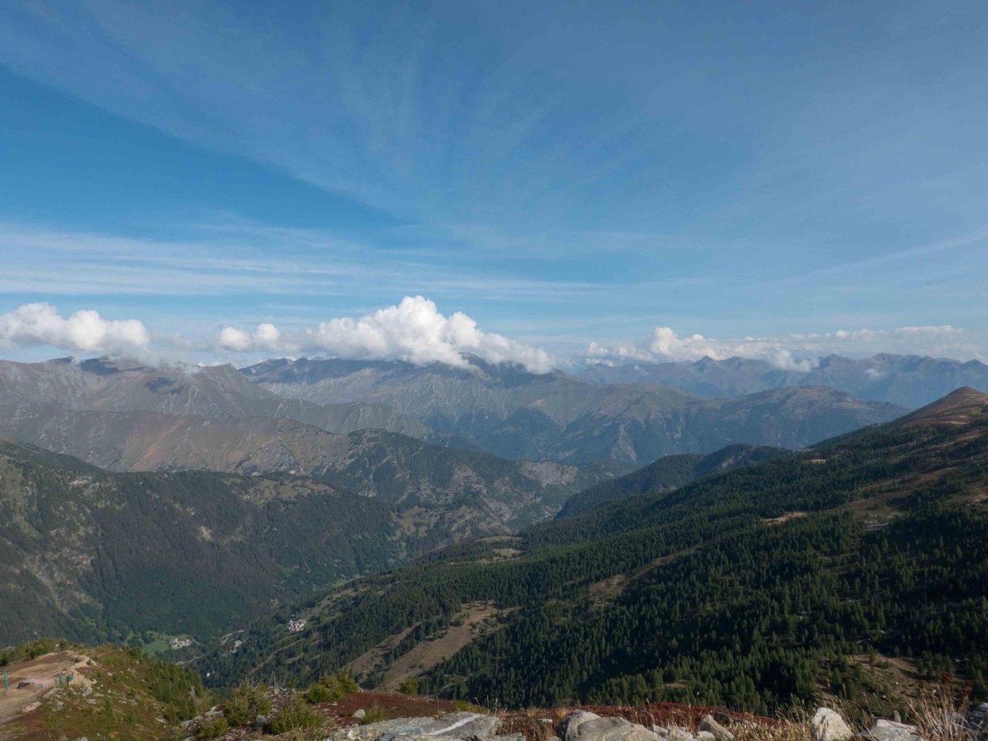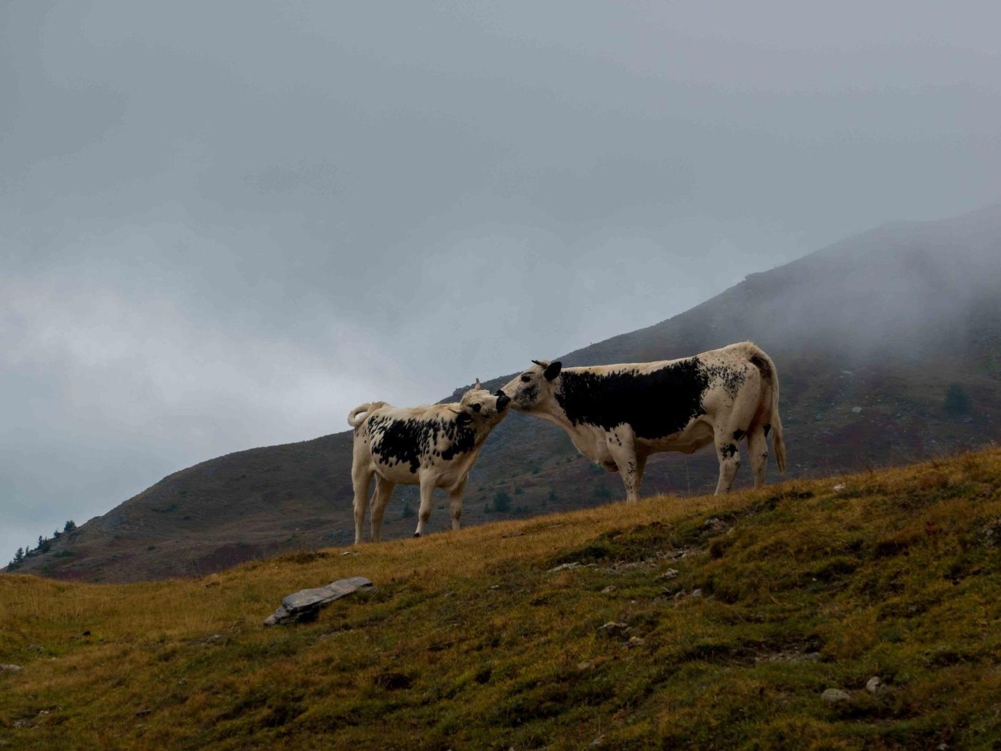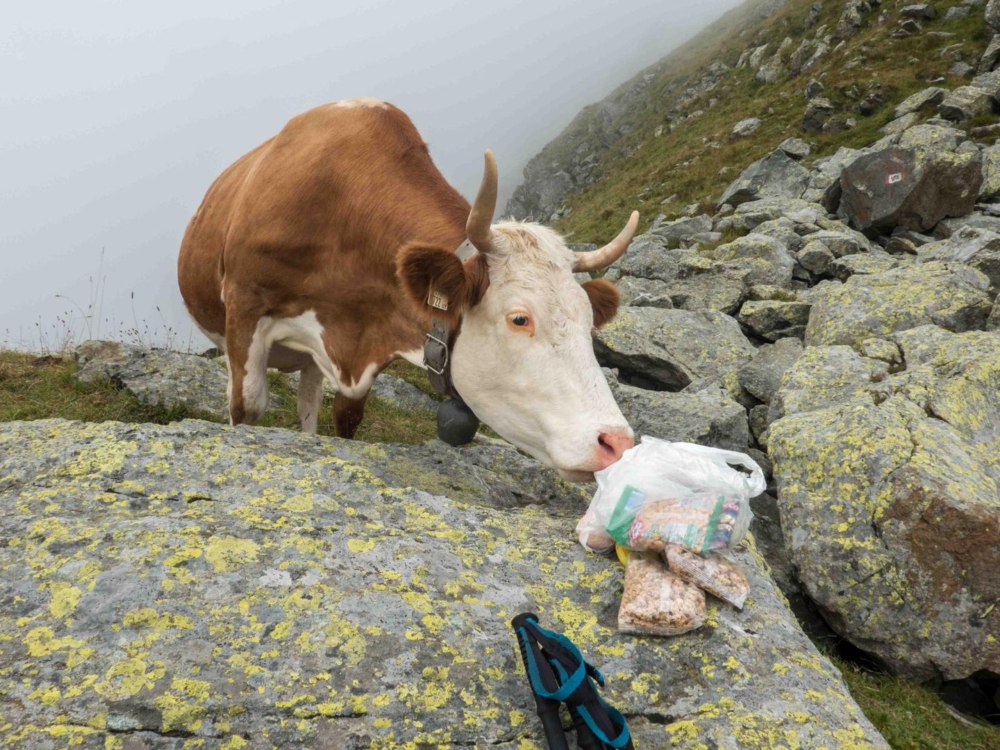 Die paar Höhenmeter zum Passo Paschiet zogen sich überraschend in die Länge. Hier zog das Wetter dann doch etwas, der Wind frischte merklich auf und die Temperaturen wurden kühler. Nach einem kurzen Abstieg begann der Gegenanstieg zum nahezu gleich hoch gelegenen Colle di Costa Fiorita. Eigentlich hätten wir hier gerne eine Mittagspause eingelegt. Die Kuh war dann aber etwas gar neugierig und wir beschlossen weiterzuziehen und die Pause zum nahen Colle Teina zu verschieben, wo wir eine luftige Aussicht nach Usseglio genossen.