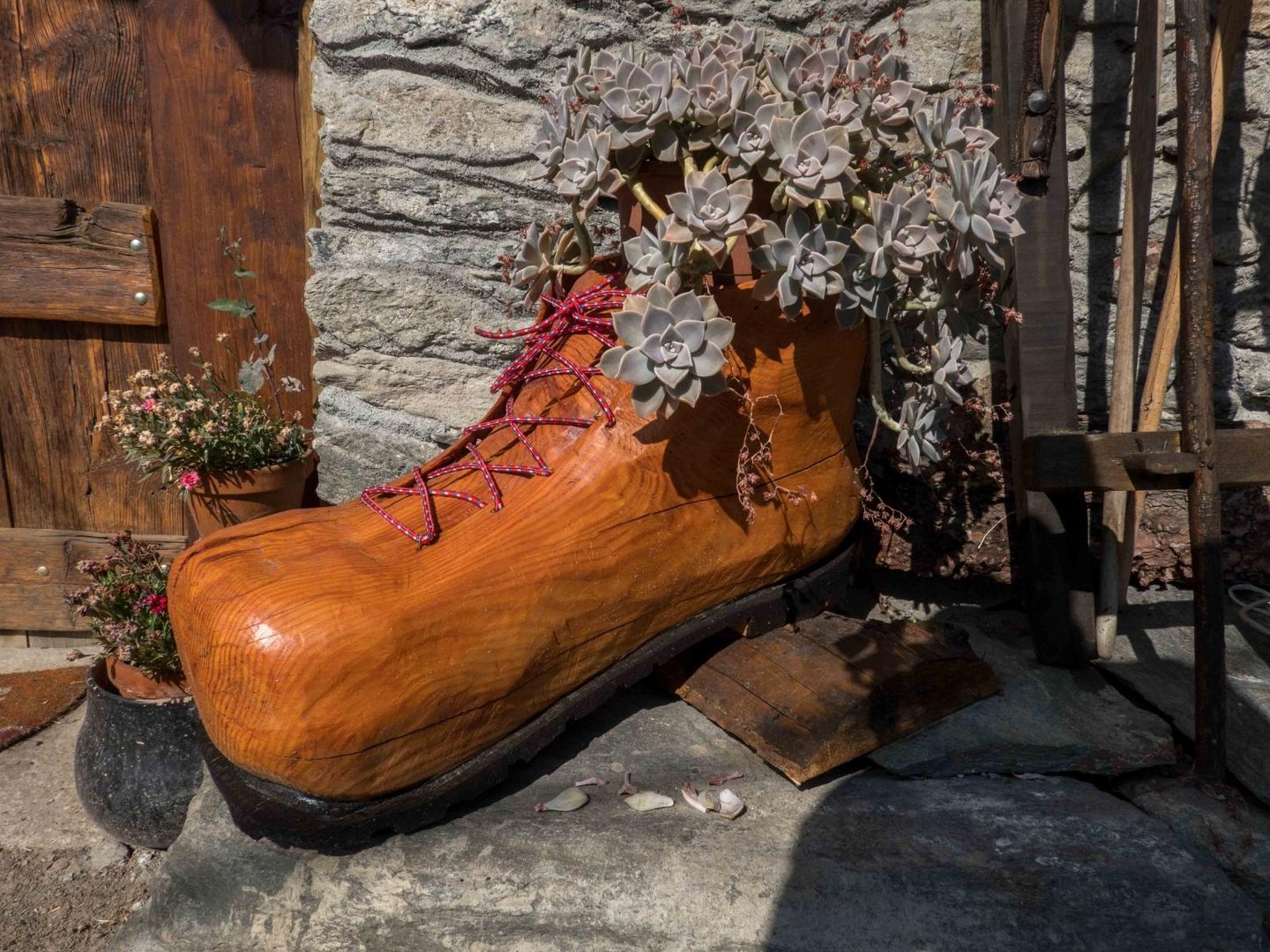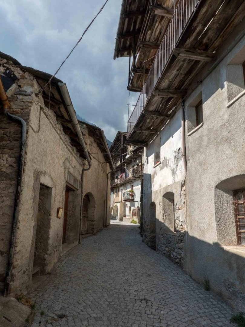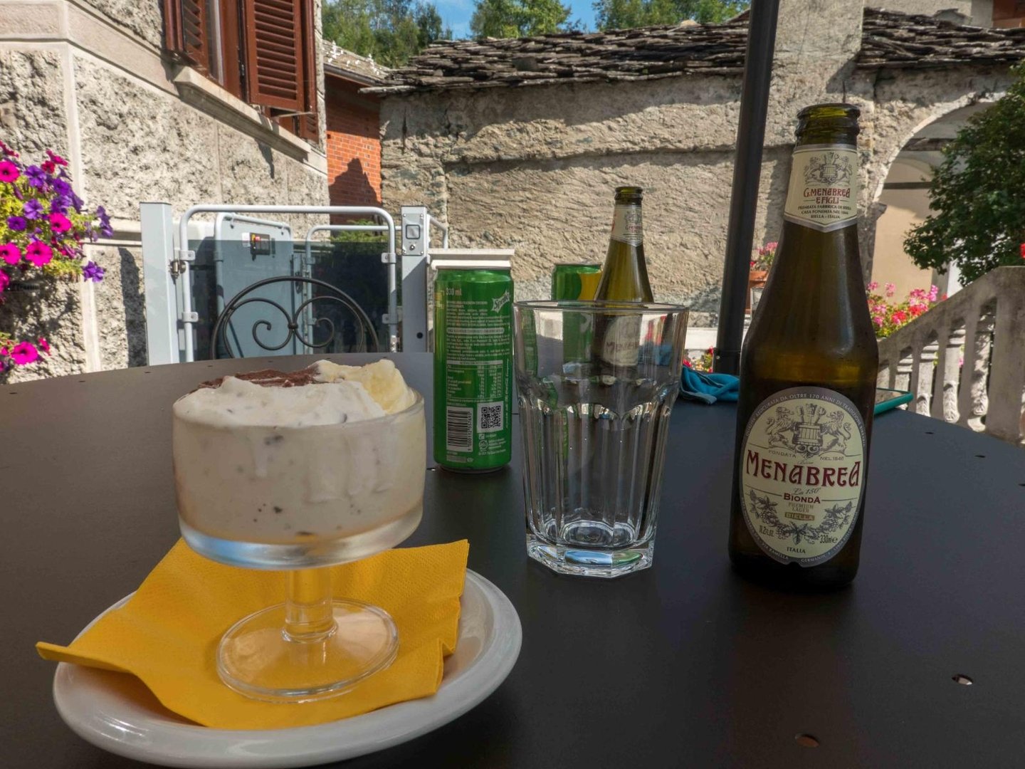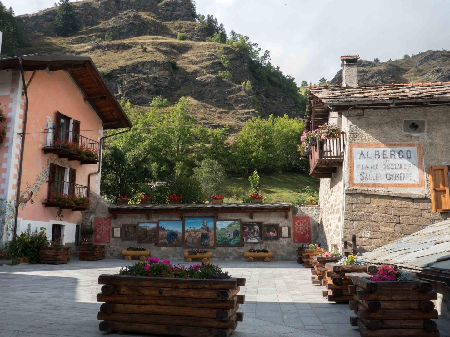 Bald erreiche ich Pialpetta und streune etwas durchs Dorf. Gemäss Rother müsste hier irgendwo ein Laden sein. Abgesehen von mir scheint hier aber kaum wer unterwegs zu sein. Den Laden finde ich bald einmal, da du hier entweder in die eine oder in die andere Richtung laufen und suchen kannst. Typisch Italien macht der natürlich erst um 16:00 Uhr auf. Ich muss lachen und beschliesse, typisch Italien eine Siesta einzulegen und mir im PT einen Caffè (Espresso) und ein feines Glace zu gönnen. Irgendwann trudelt auch Ch. ein und wir quatschen eine Weile. Für die nächsten Tag hat mir sja das Les Montagnards in Balme empfohlen. Wenn Sja dermassen davon schwärmt kann ichs nicht einfach links liegen lassen. Wies der Zufall will hat auch Ch. für Morgen dort gebucht (heute bleibt er hier in Pialpetta). Er bietet mir sein Handy an und so schreibe ich eine SMS (+1 für meinen Italienischkurs) ins Les Montagnards. Das läuft doch wie geschmiert. Damit sich das nicht total zu einer Hüttentour entwickelt ists Zeit weiterzuziehen. Davor natürlich noch ins nahe Alimentari (Einkaufsladen) um Futter aufzustocken. Ich mag diese kleinen italienischen Alimentari total. Ich füll mit den Korb wieder grosszügig mit Obst, Käse und Brot. Übertreiben muss ichs ja nicht, morgen gibts auch wieder ne Einkaufsgelegenheit.