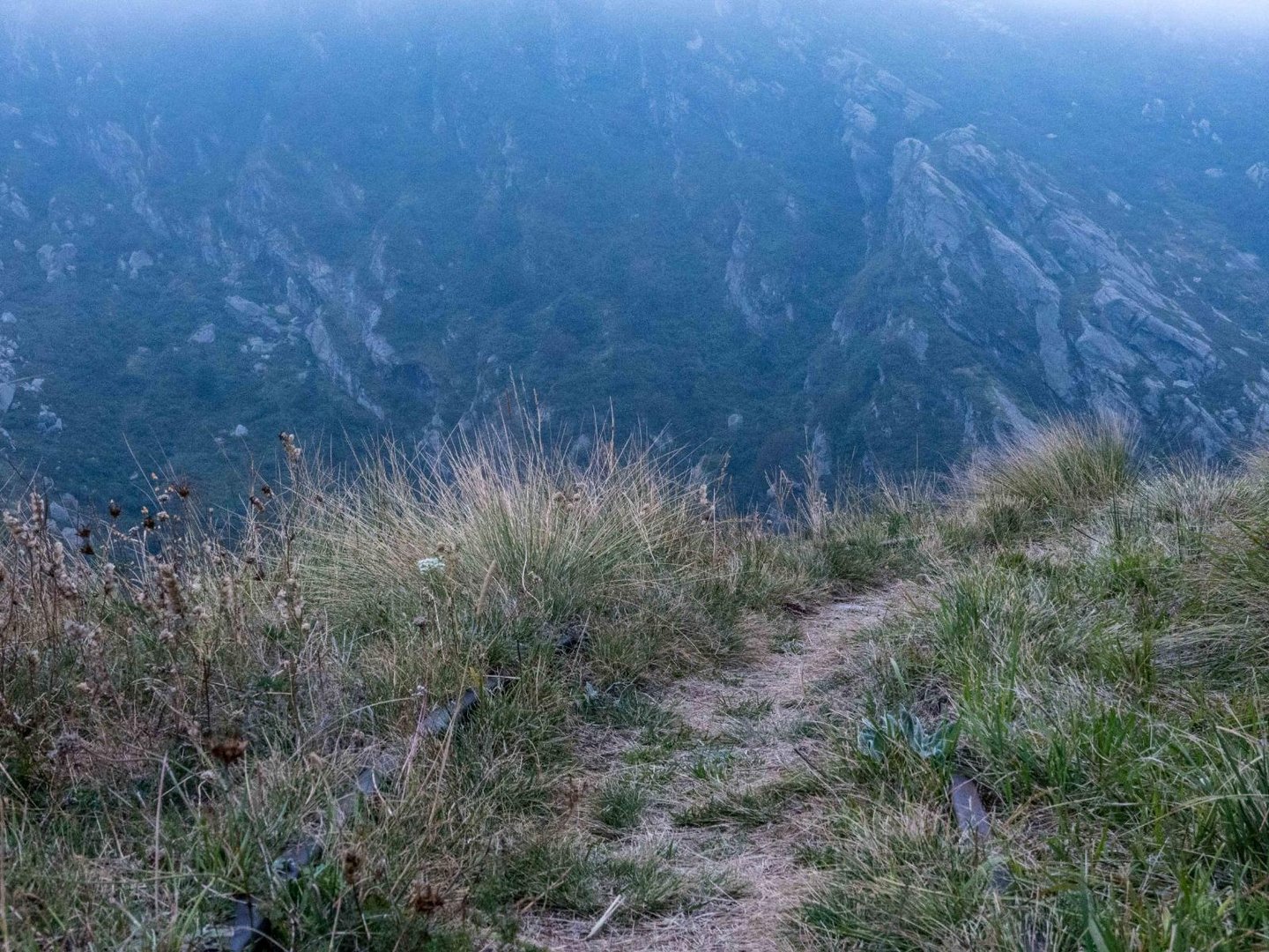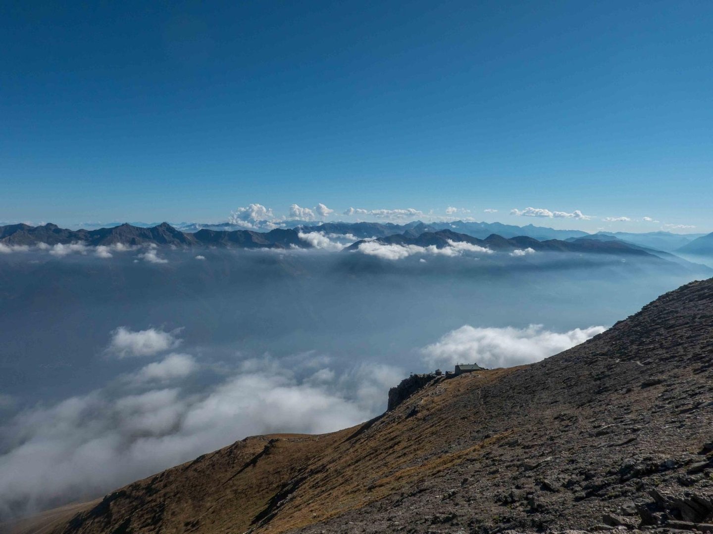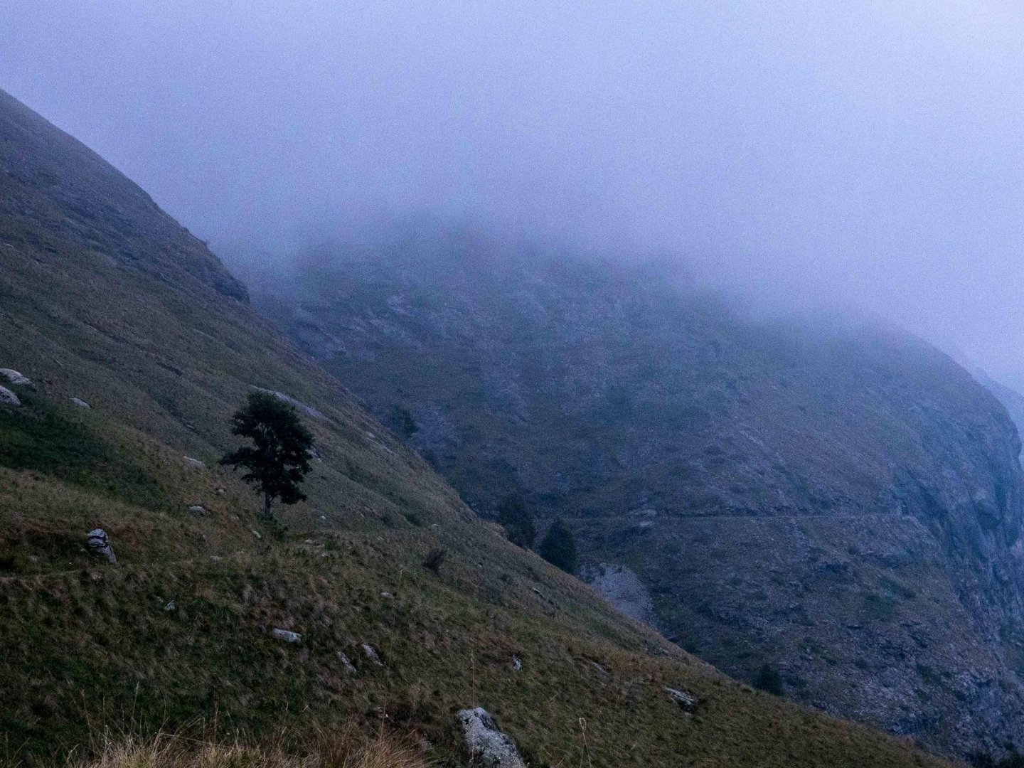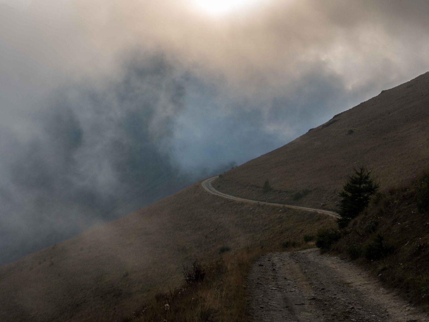 Dort gönnte ich mir nochmals einen Kaffee (Eis war leider aus) und füllte meine Flaschen. Hmm, schon 17 Uhr. Was tun? Ich beschloss weiterzugehen und lief zügig weiter. Ich war dermassen im Fluss und hatte den perfekten Rhythmus gefunden, sodass ich den steilen Anstieg zum Colle Bicocca in Rekordzeit zurücklegte. Oben angekommen war ich überwältigt. Die Sonne und der Nebel zauberten eine wunderschöne Lichtstimmung am Himmel.