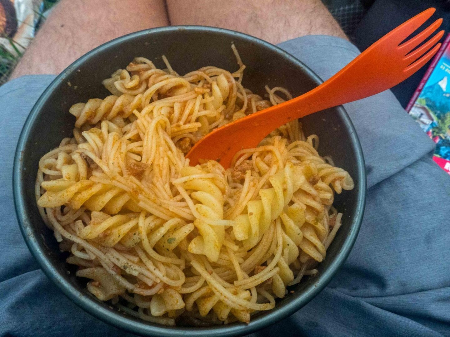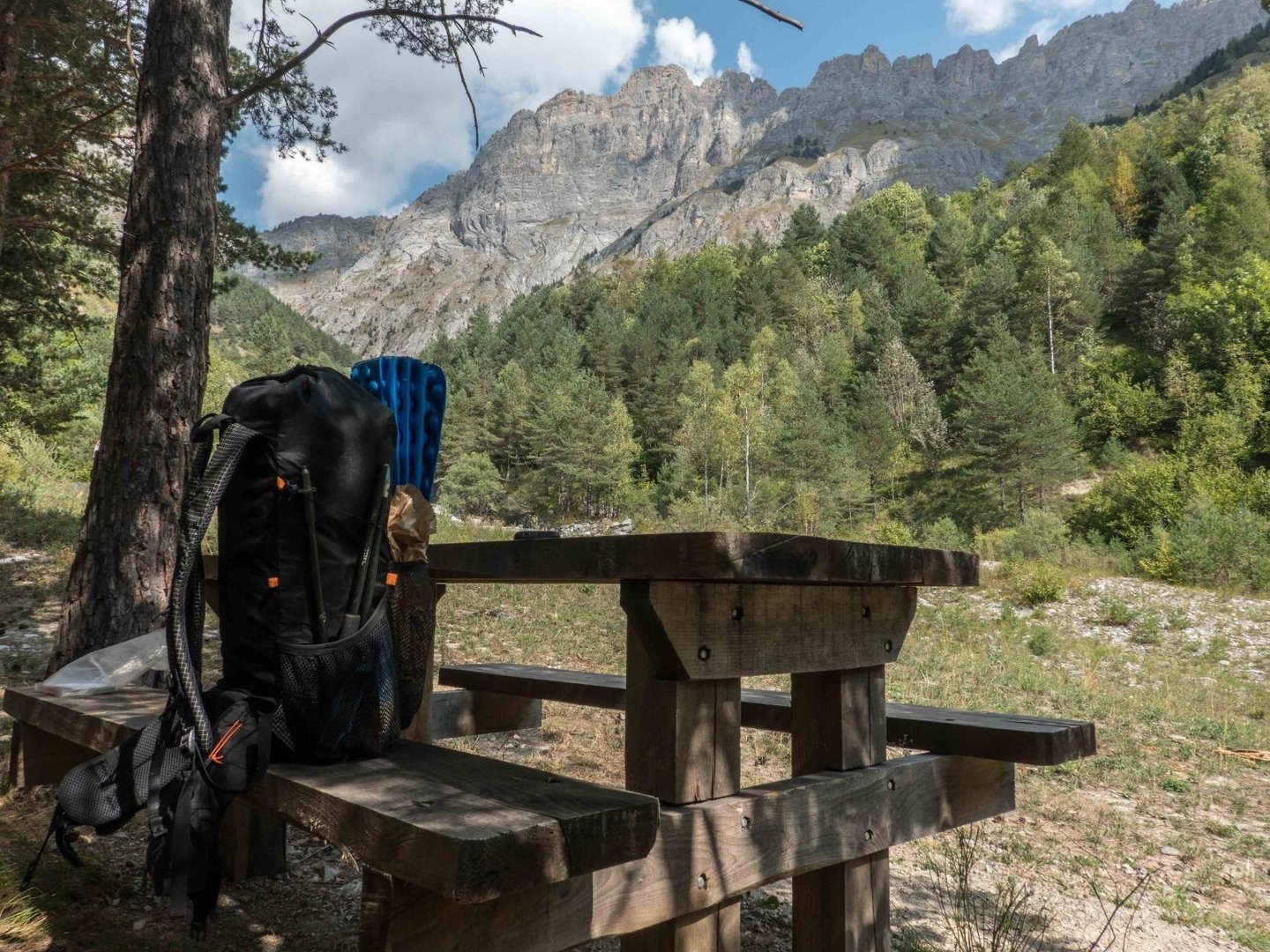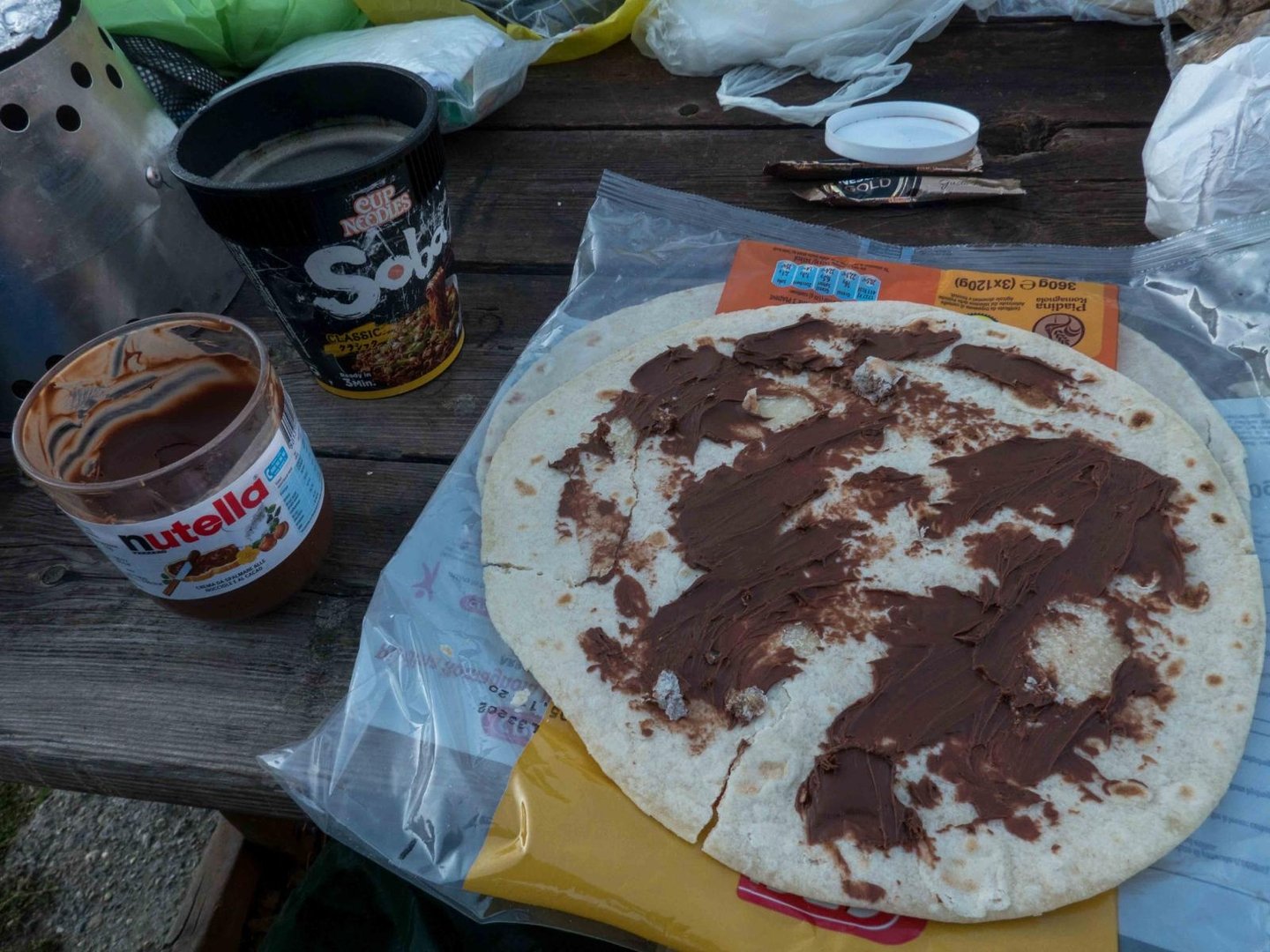 Ich wählte den Weg via Fluss und nicht die Alternative via Pessa. Unten beim Fluss stiess ich auf einen herrlich gelegenen Picknickplatz samt Wasserhahn und so beschloss ich Mittagspause zu machen. Viel Essen hatte ich nicht mehr und so kochte ich für einmal etwas Warmes zu Mittag.