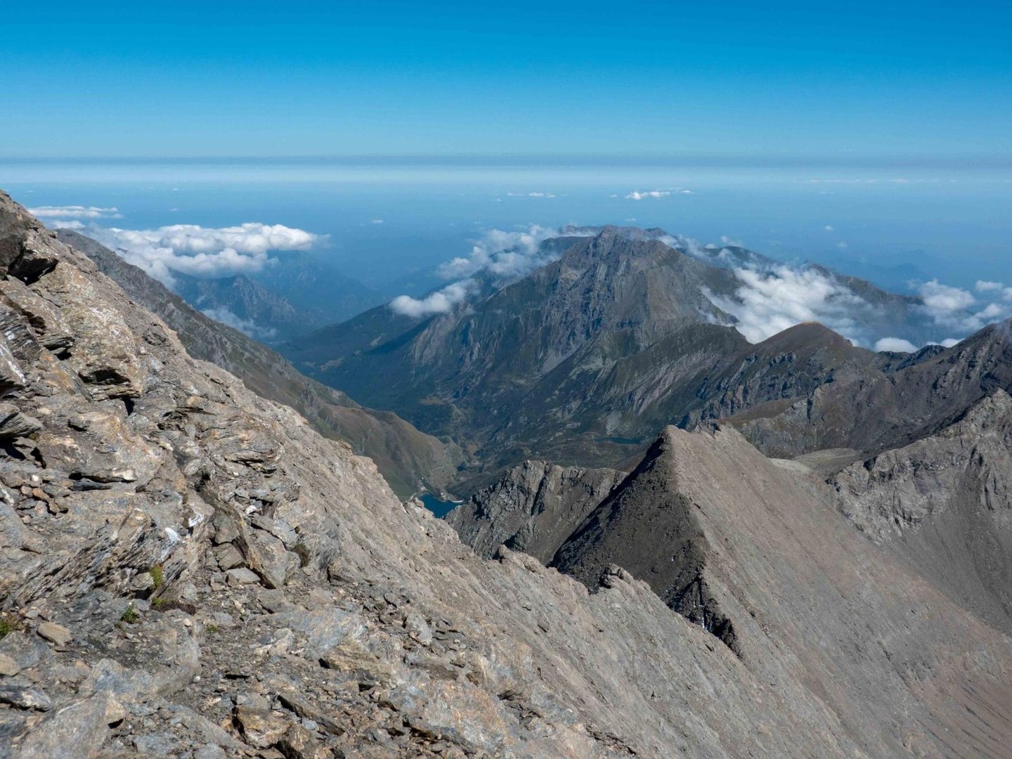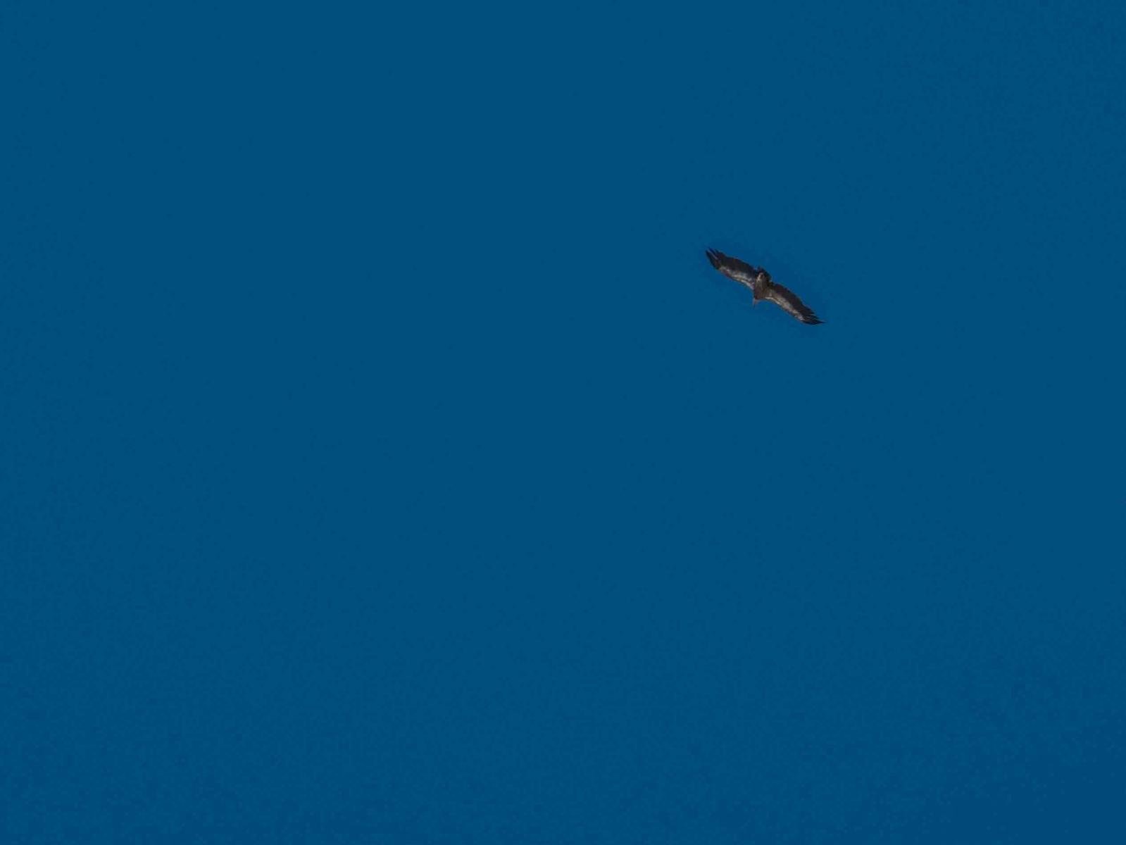 Er deponierte seinen Rucksack auf der Hütte und kam mit sehr leichtem Gepäck. Ich habe ihn natürlich nur ganz minim darum beneidet. Die Sonne brannte noch immer gut und der Schweiss floss fleissig. Wir konnten aber flüssig und zügig aufsteigen da kaum noch Leute unterwegs waren und die paar Menschen waren meistens im Abstieg. Unterwegs sahen wir noch einige Gänsegeier. Ch. erkannte die Tiere sofort und auch die Italiener waren ganz aus dem Häuschen. Auf dem Foto siehts nun natürlich wie eine Brieftaube aus, aber der Anblick hatte schon was majestätisches. Mit der passablen Zeit von 90 Minuten ab der Hütte erreichten wir den Gipfel.