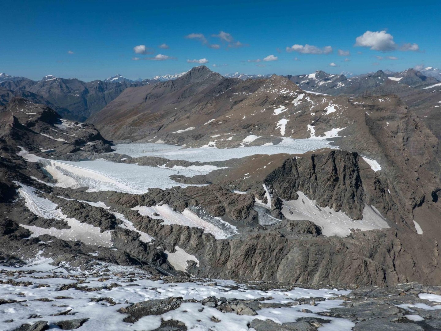 Rechts der Rocciamelone, links das Rifugio Cà d’Asti. Die direkte Querung verläuft etwas unterhalb meines Daunens