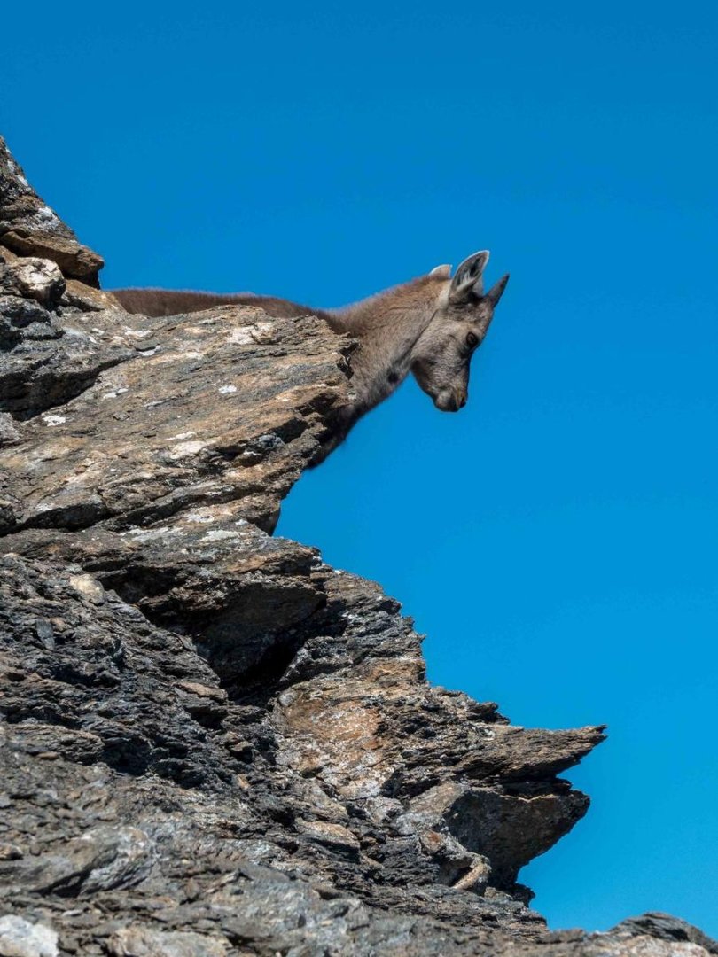 Jetzt wars an der Zeit mein Nachtlager zu inspizieren. Natülich klebte auch hier das obligate "wegen Corona geschlossen Plakat" (wie überall die letzten Wochen), was aber keinen, auch mich nicht davon abhielt die Biwaks trotzdem zu benützen. Hier kam aber dazu, dass das Biwak komplett ausgeräumt wurde. Zusammen mit der Wetterprognose des InReach rechnete ich mir die zu erwartenden Temperaturen auf dieser Höhe aus. Mit einer gewissen Enttäuschung und schweren Herzens beschloss ich meinen Plan zu verwerfen und ebenfalls wieder abzusteigen. Im Abstieg begegente uns noch ein Steinbock Kitz. Was für ein schöner Anblick.