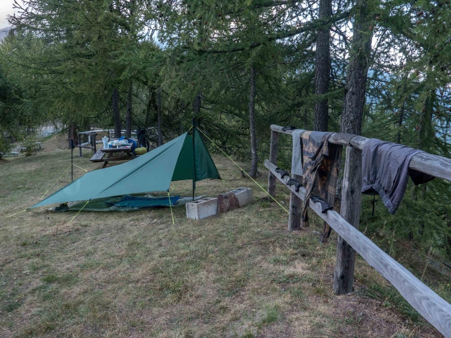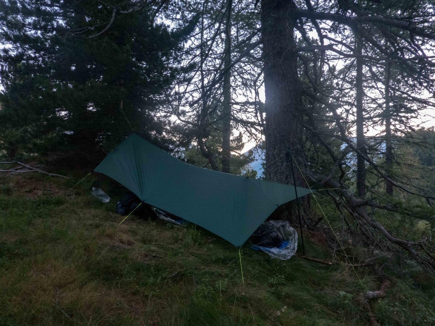 Wenig später sehe ich auf meinem Etrex, dass hinter dem Rif Vulpot ein Zeltplatz ausgewiesen ist. Das Ziel ist gesetzt und ich freue mich über die kleine Entdeckung. Dort angekommen war reichlich Platz und im letzten Licht stellte ich mein Tarp auf. Im Anschluss noch Katzenwäsche beim Wasserhahn (wieder mal vergebens Wasser mitgetragen