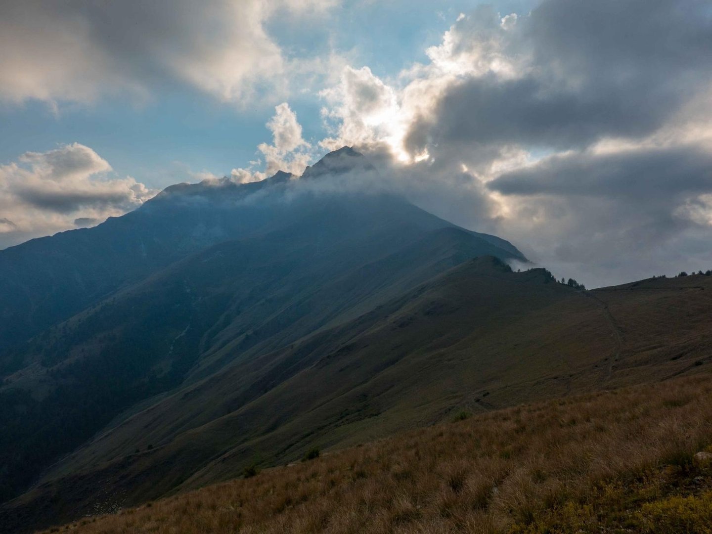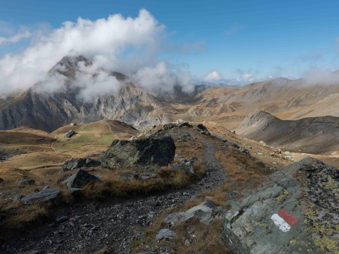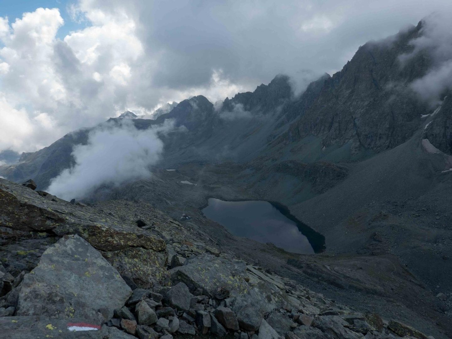 Auf dem Colle dei Viso angekommen versteckte sich der Monte Viso gerade hinter einem Nebelschleier. Der zeigt sich schon nochmal. Ich überlegte kurz am Abstecher für den Viso Mozzo rum. Hmm, eigentlich hab ichs am Morgen etwas gar gemütlich genommen, aber nochmals die 3000 Meter Marke zu knacken überzeugte mich dann. Ausserdem habe ich für heute ohnehin kein Plan wo ich übernachten will.