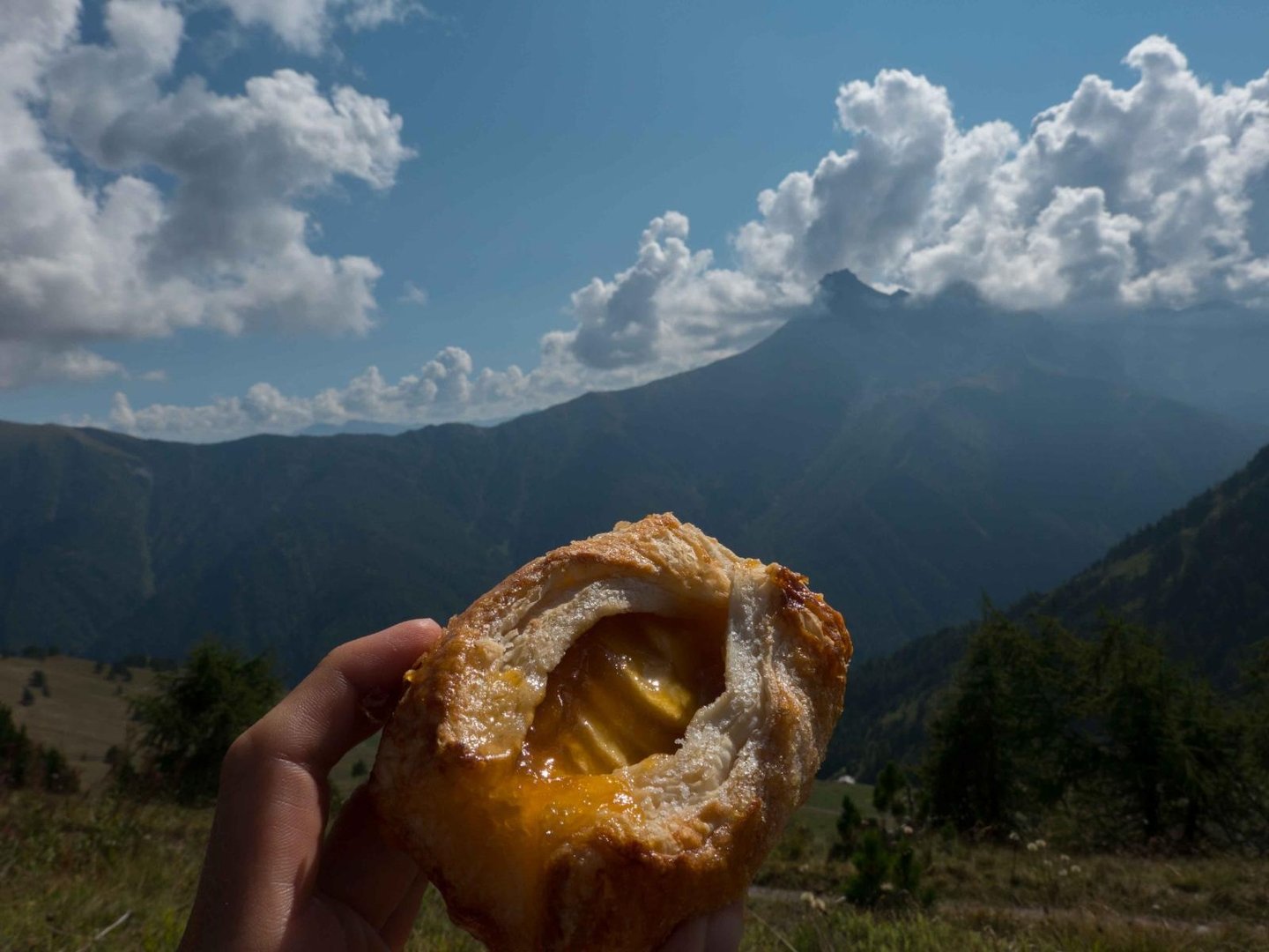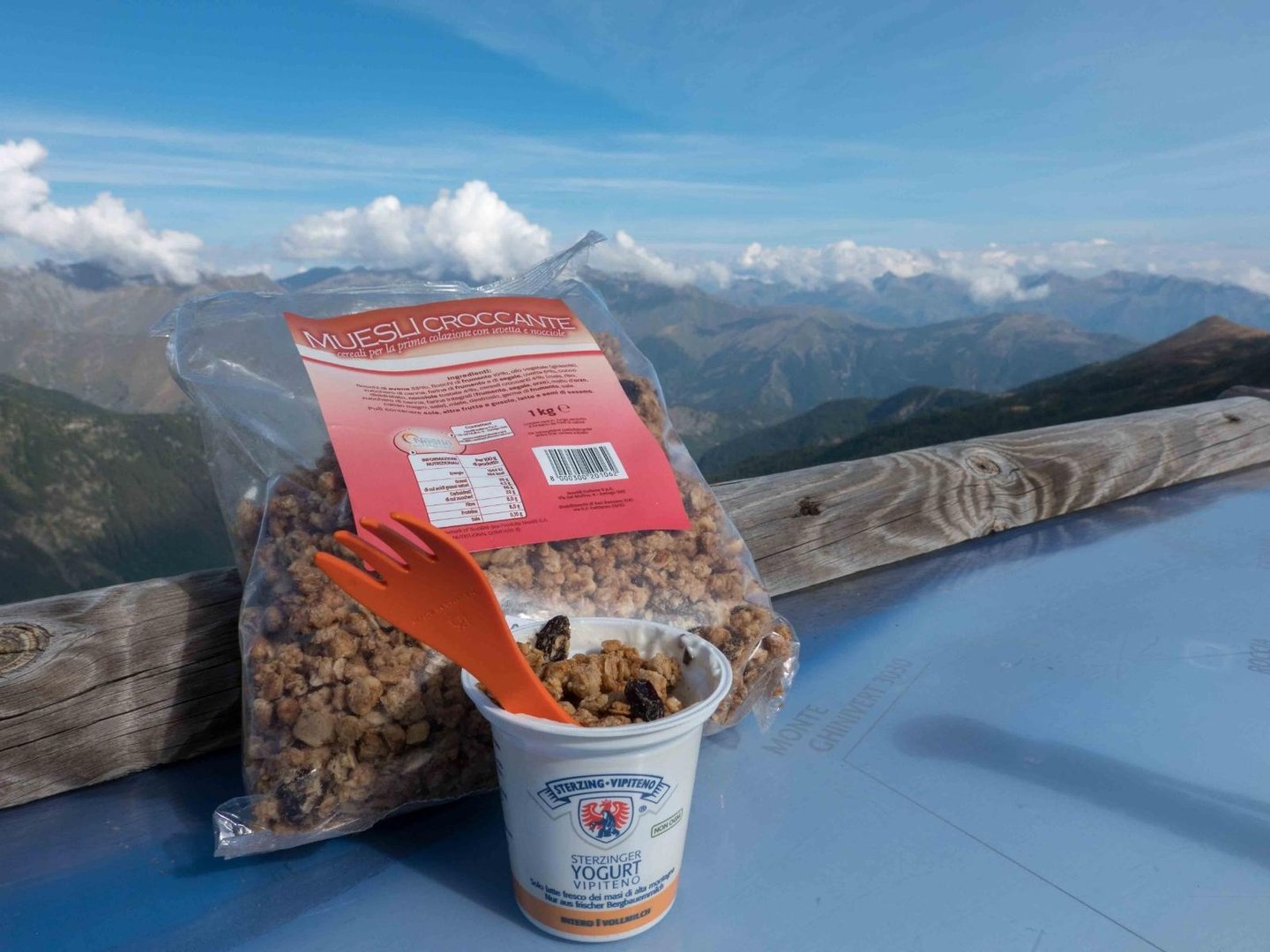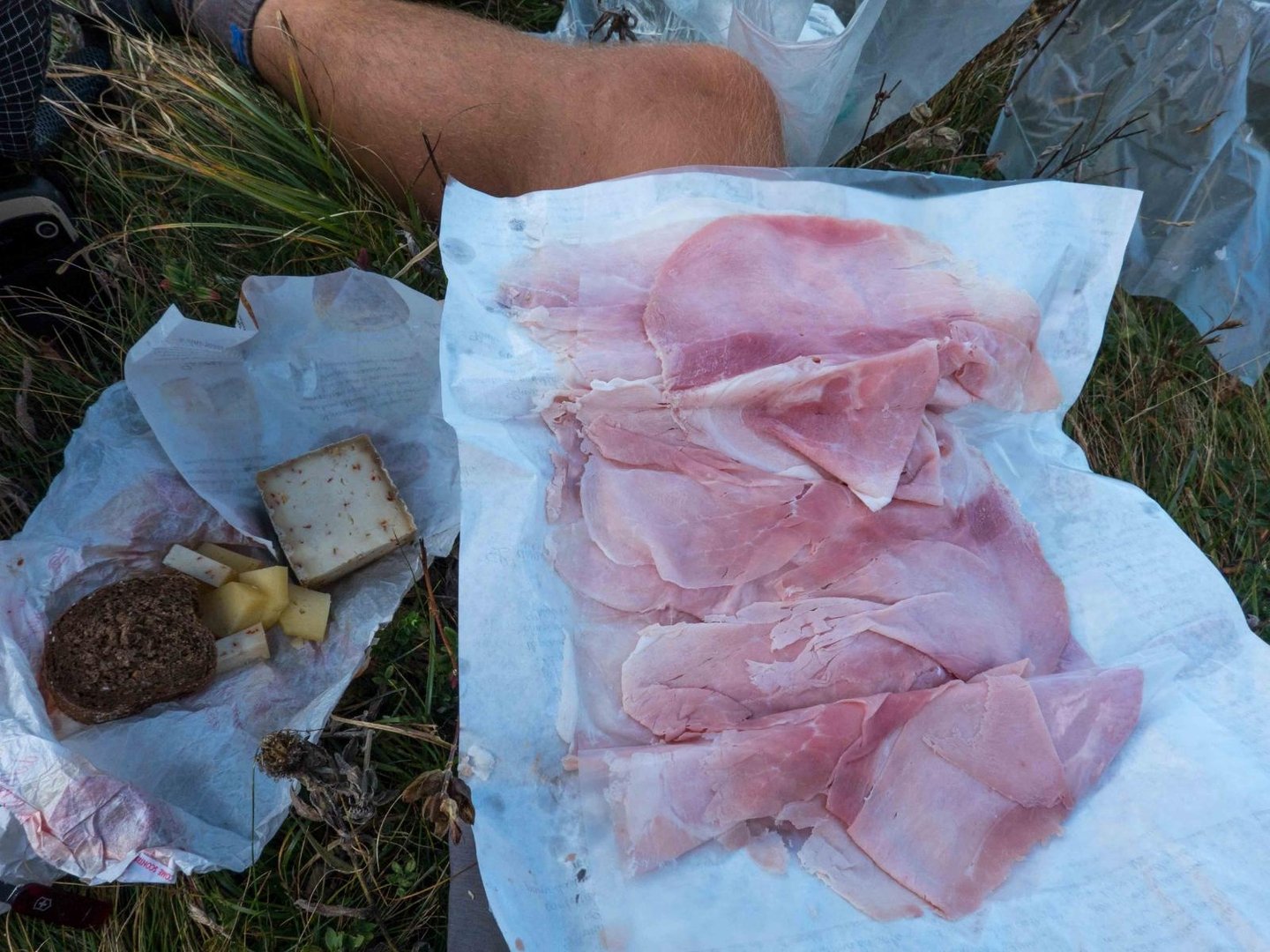 Auch wenn ich nun die Baumgrenze überschritten habe, ist die Temperatur noch sehr angenehm, beinahe kühl. Wenige Meter unterhalb des Colle della Crocetta gönne ich mir eine ausgiebige Pause mit super feinem Essen beim Lago di Vercellina.