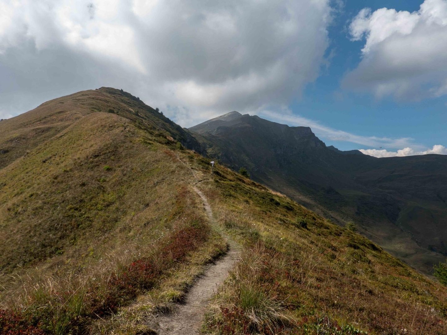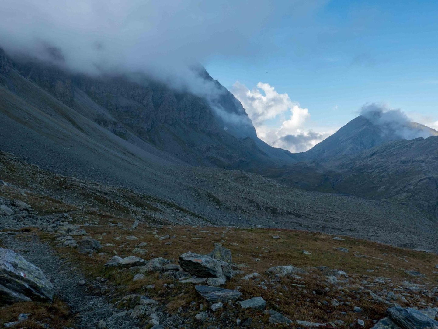 Ich geniesse den schönen Bergwanderweg in vollen Zügen. In meinem „Tagebuch“ habe ich mir für die Variante „steil aber geil“ vermerkt. Vorbei an einer kleinen Kuhherde erreiche ich bald den Pass. Das Biwak ist leider geschlossen und mein InReach prognostiziert kühle Temperaturen für die Nacht. Vielleicht ists doch bald mal Zeit für einen wärmeren Quilt. Nun hatte ich doch schon einige Nächte in höheren und kühleren Lagen.