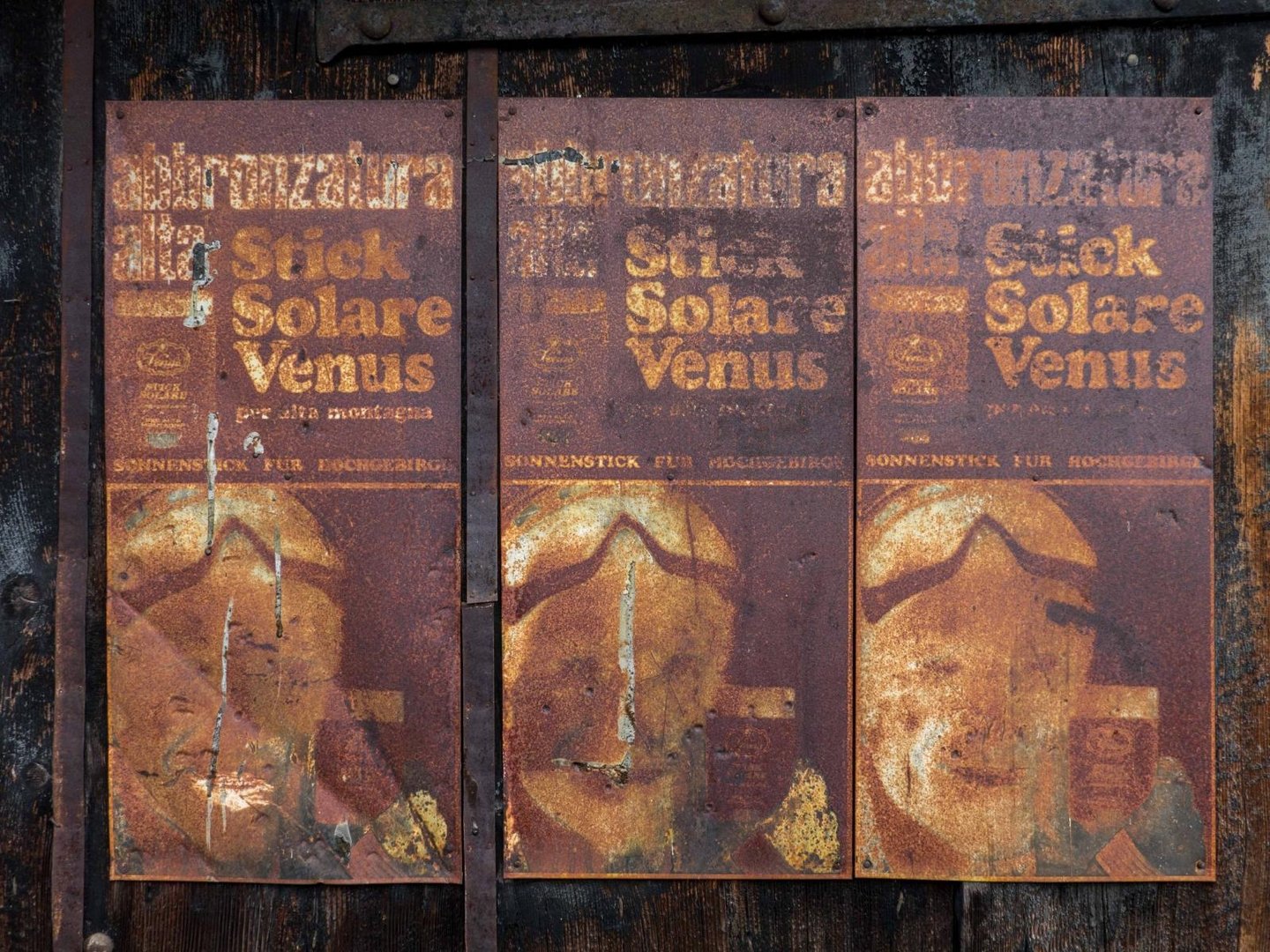 Alte Werbung für Sonnensticks in Stroppo. Das Teil könnte man hier sicher für viel Geld verkaufen