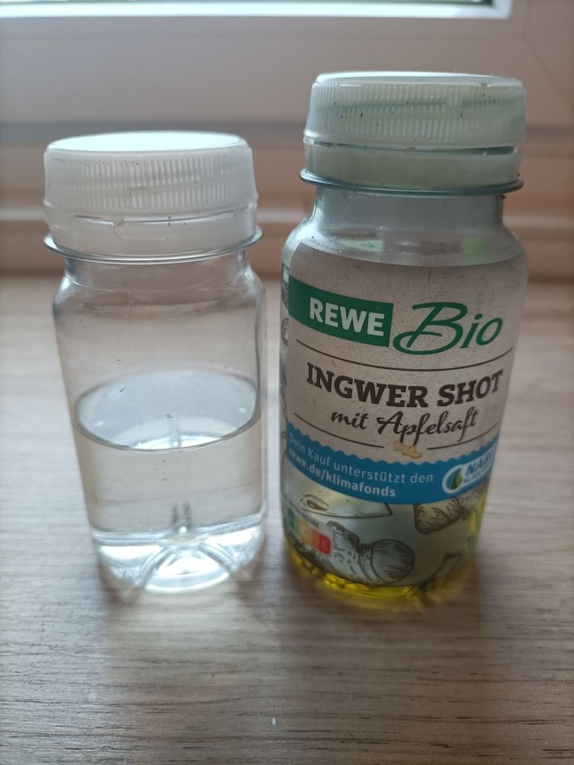 Daraus ist mir mein Olivenöl ausgelaufen. Vermutlich weil die Flasche etwas gequetscht wurde. Die weite Öffnung mit dem kurzen Gewinde ist nicht sonderlich stabil. Aber der Ingwershot war lecker