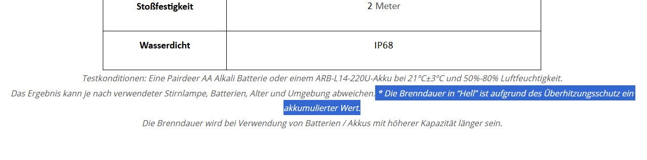 300 Lumen über 7 Stunden mit einem 14500-er? Ich bin da schon ein bisschen am zweifeln. Ich habe ein paar so Lampen hier.