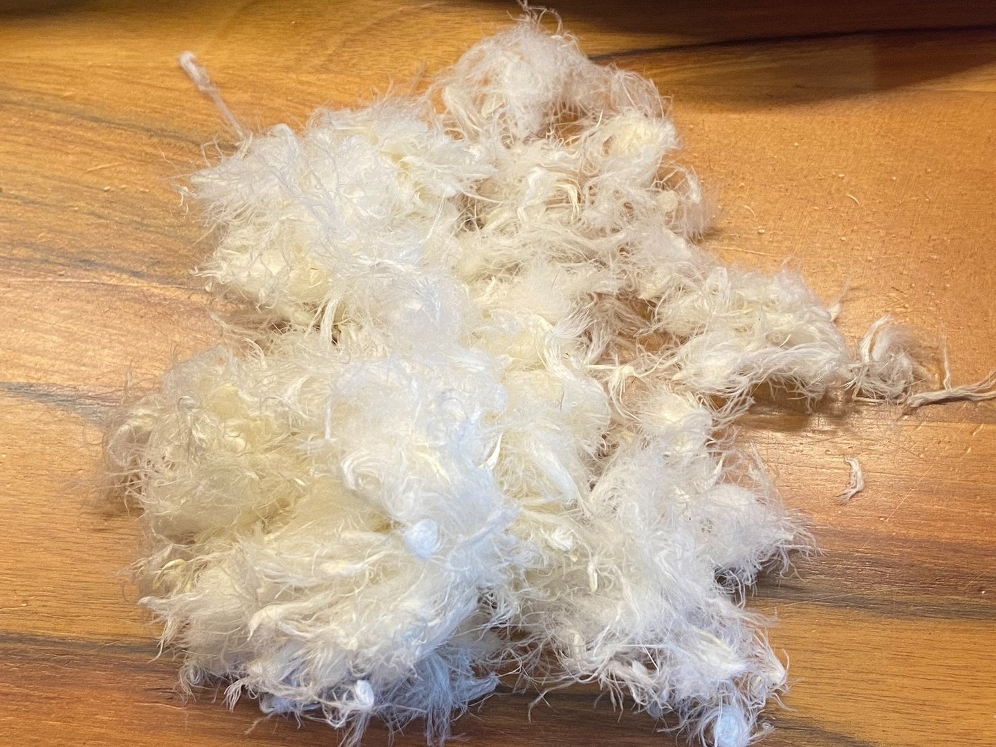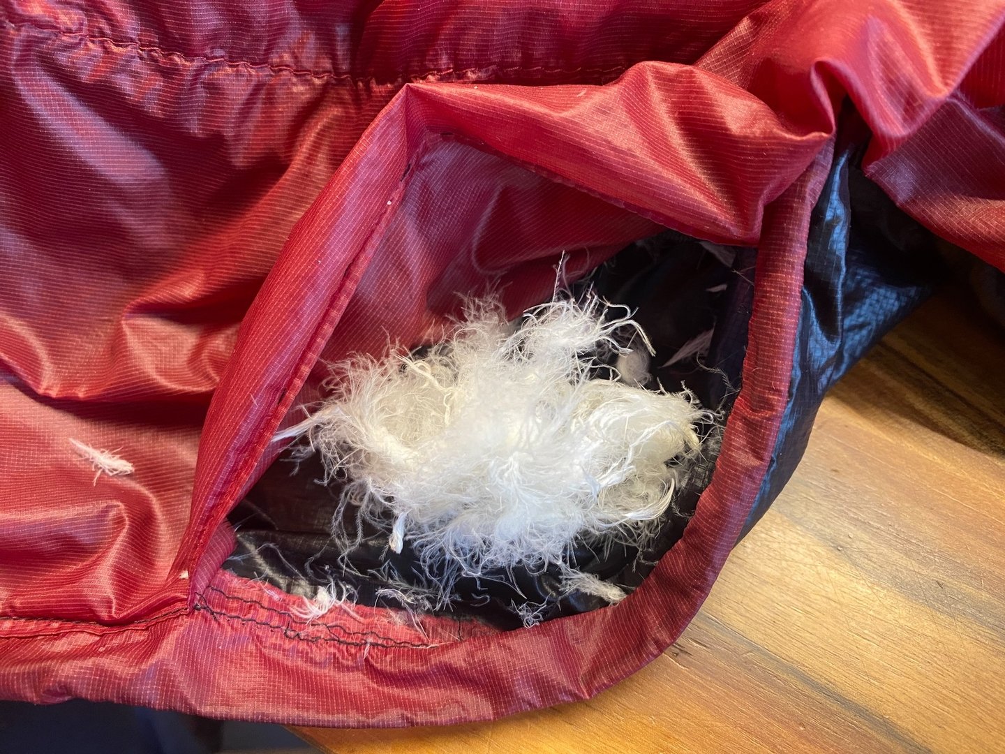 • Der Loft meines zehn Jahre alten MYOG Daunenschlafsacks läßt seit einiger Zeit zu wünschen übrig - vor allem in der obersten Querkammer, in die ich unvermeidlicherweise hineinatme. Deshalb habe ich noch vor der anstehenden Wäsche die oberste Kammer geöffnet und die Daune inspiziert.
