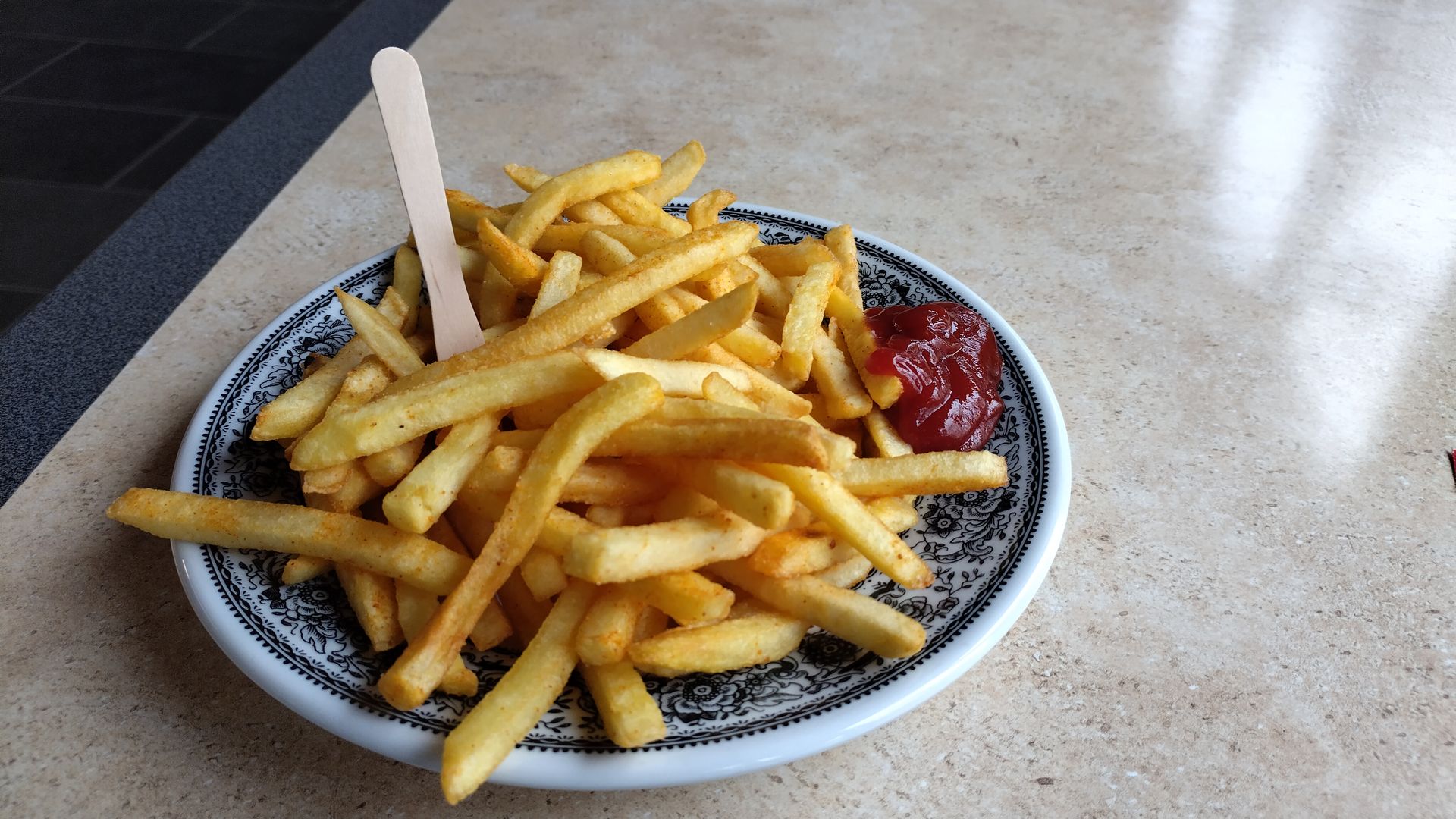 Durch zwei alte Tunnel läuft man in einer großen Schlaufe um die imposante Burg, bevor man an einem Bergwerk-Besucherzentrum und einer rekonstruierten Keltensiedlung vorbei läuft. Zu meiner Überraschung hat das Besucherzentrum sogar geöffnet und ich habe genau 3€ in Münzen dabei, die ich effizienter mit mir herumtragen könnte, so dass ich das Geld gegen die einzigen Sonnenstrahlen des Tages tausche. Frittierte Kartoffelstäbchen sind zumindest nah genug dran.