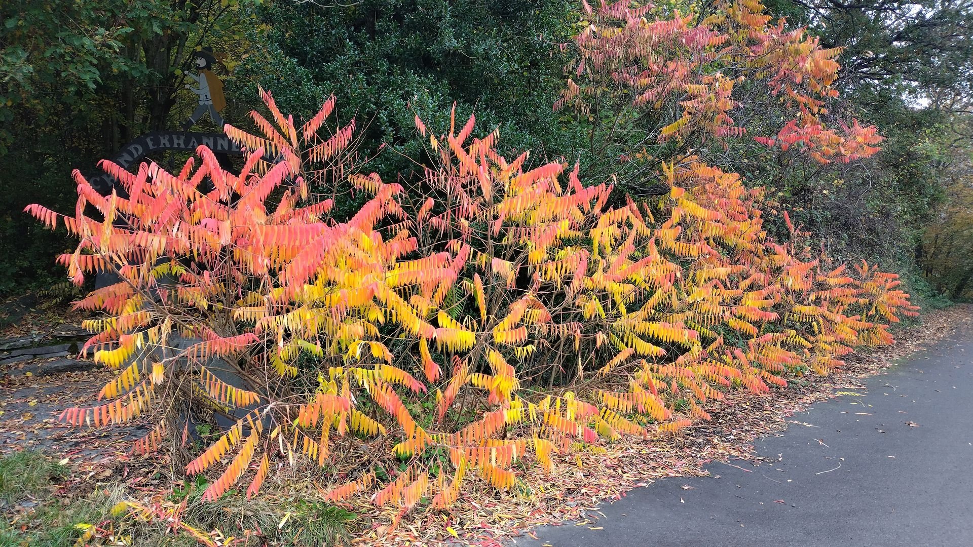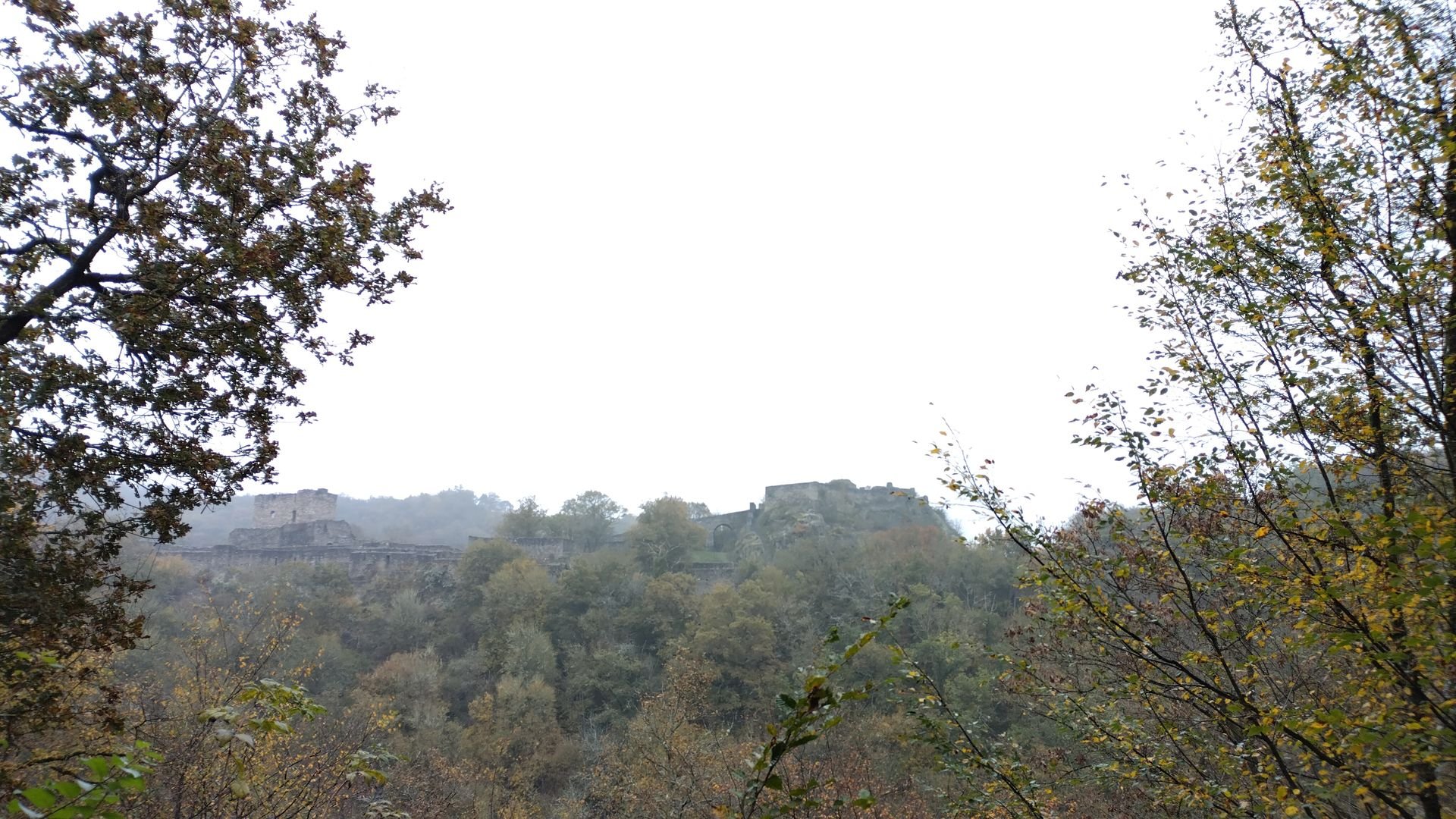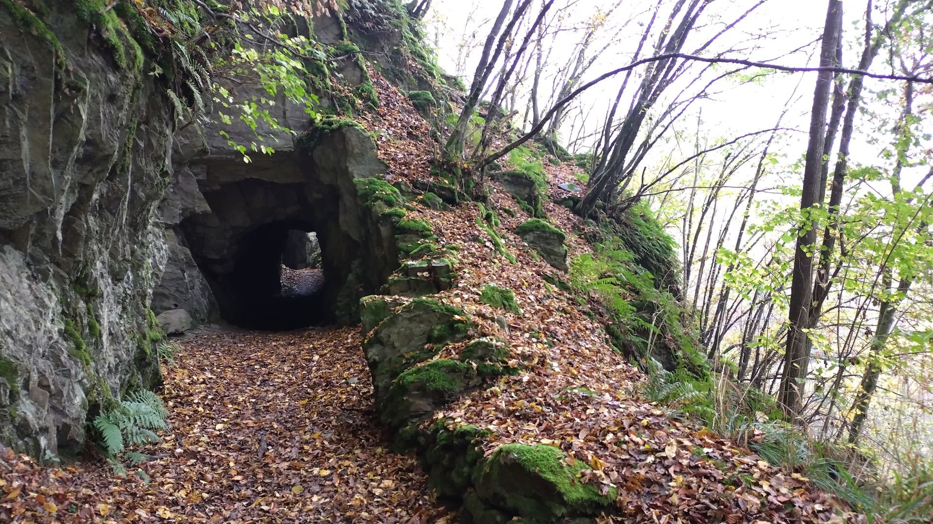 Trotz dem grauen Wetter sind die Herbstfarben wunderschön (die Handykamera schafft es nicht so ganz das abzubilden). Bei Hahnenbach quere ich die Straße und bleibe ein Stück auf dem Asphalt, da der Weg parallel durch den Matsch führt. Kurz danach kann ich an einem "offenen Wasserhahn" am Haus Neumühle meine Flasche füllen, bevor es steil bergauf in Richtung Schmidtburg geht.