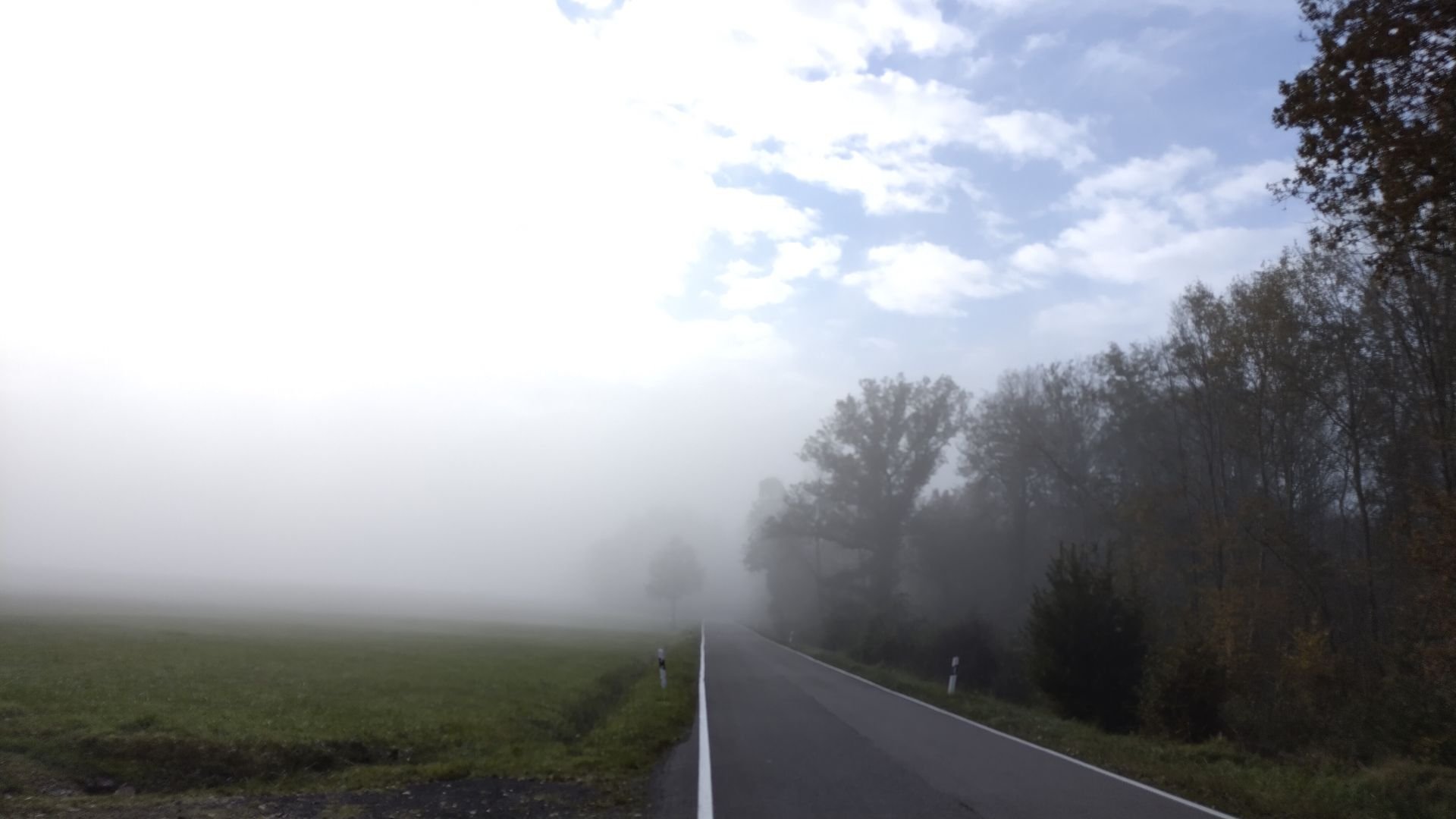 Auch wenn es frisch ist, war der Kälteschock nur durch langes herumsitzen im viel zu warmen Zug, sobald ich mich bewege ist es warm genug. Nach den ersten Metern durch Kirn geht es direkt ein bisschen bergauf und man wärmt sich gut auf, die Hoffnung auf Aussichten schwindet dagegen im Nebel dahin.