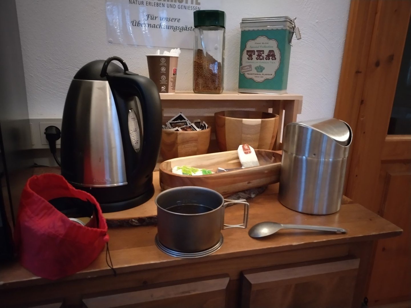 An der Lauschhütte selbst wird mir klar, dass auch hier keine anderen Wanderer anwesend sind. Ich stelle mein Tarp unter einen Baum auf der zugewiesenen Wiese und gehe erstmal in den zugehörigen Gasthof. Die Bedienungen sind nett und lassen mich sitzen bis sie schließen müssen, auch mein Handy wird mir freundlicherweise noch einmal aufgeladen. Als der Gasthof gegen 21h schließt liege ich erst kurz im Zelt, bevor ich auf Toilette gehe: Im hinteren Teil des Gasthofes ist die Toilette für Übernachtungsgäste durchgängig geöffnet. Hier ist es nicht nur warm, sondern es gibt WLAN, einen Stuhl und eine Kleine Tee/ Kaffee Station mit einem Wasserkocher