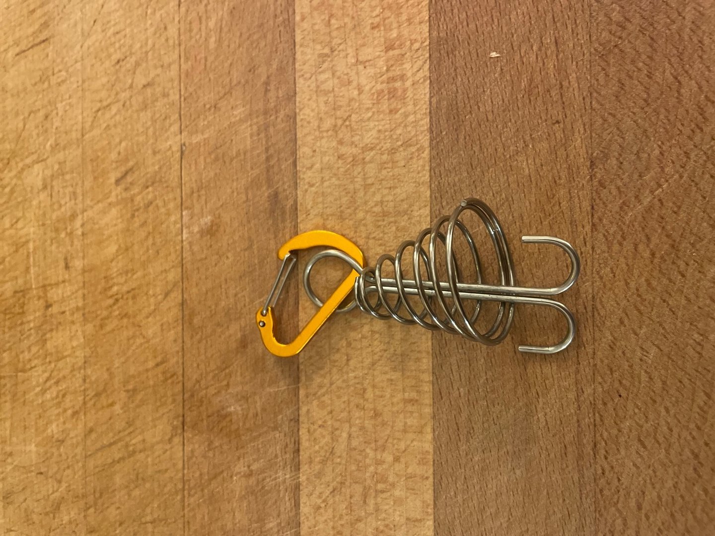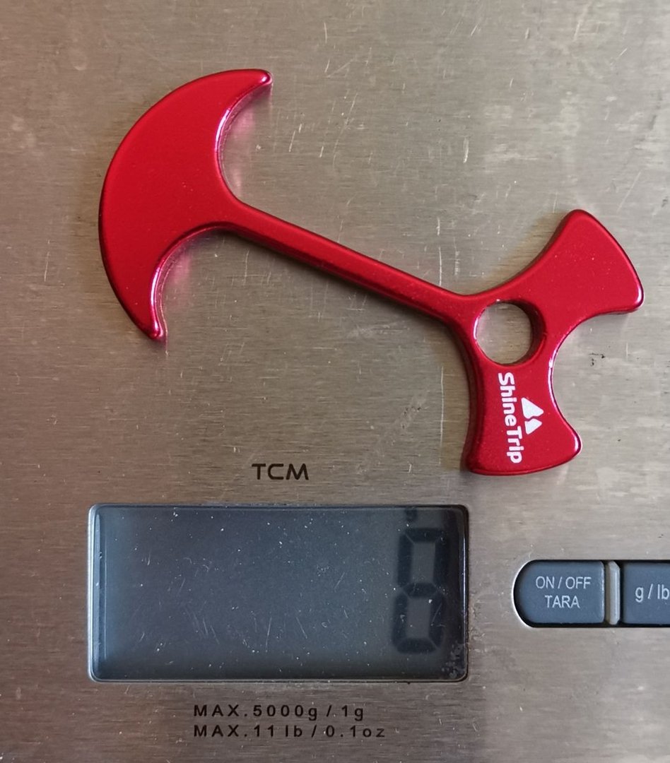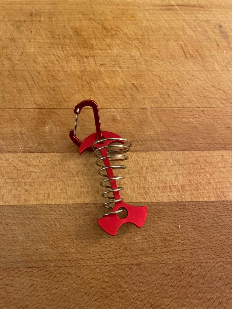 • Ich hab die roten Chinadinger ohne Feder, die wiegen so 8g, der mitgelieferte Karabiner 6g, wobei ich eher 15-20cm Gummilitze dran knoten würde. Bislang bin ich noch nicht in die Verlegenheit gekommen sie zu benutzen, aber da in Hessen einiges an Trekkingplätzen dazu gekommen ist, werden die wohl irgendwann Premiere haben.