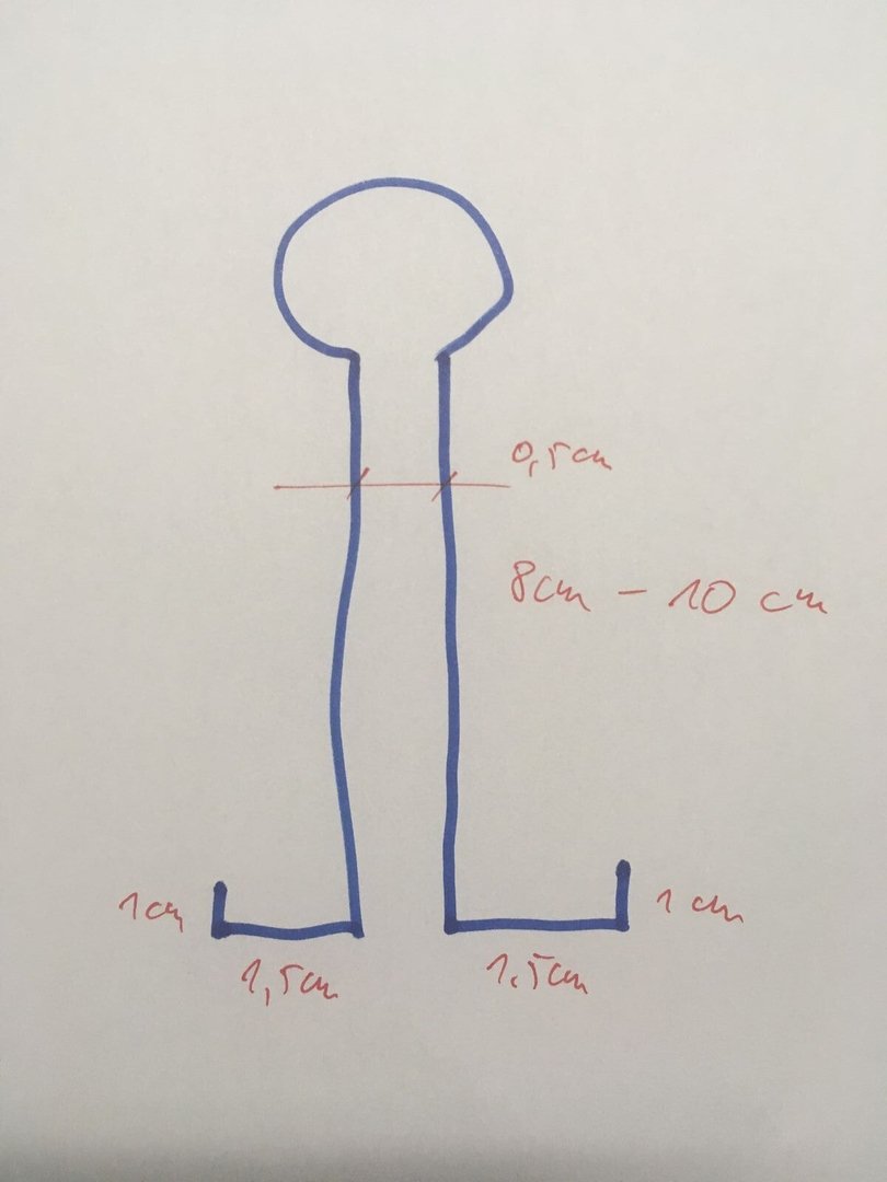 • Mein Vorschlag, den ich allerdings noch nicht ausprobiert habe, wäre der, dass Du Dir Fahrradspeichen (Edelstahl, 2 mm dick, Länge lt. Bild ausrechnen) kaufst und selbst (oder ein Bekannter) diese einfachen Plattform-Anker lt. Bild biegst. Die "eckigen" Biegungen (ist nur ein Vorschlag von mir) können auch rund sein, lediglich das Prinzip der Plattform-Anker sollte gewahrt werden.