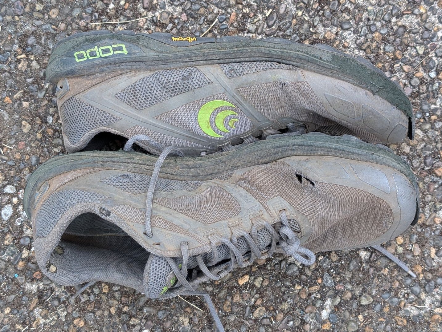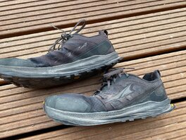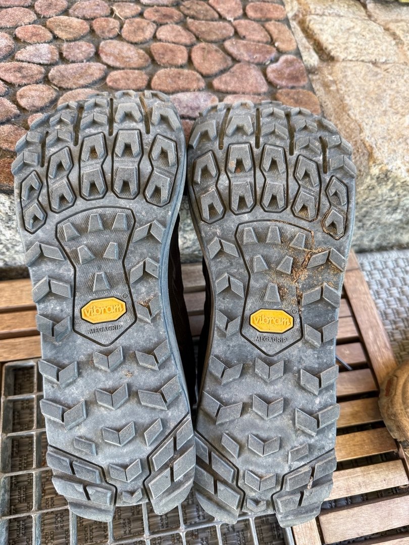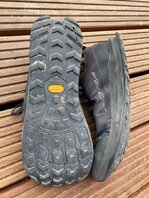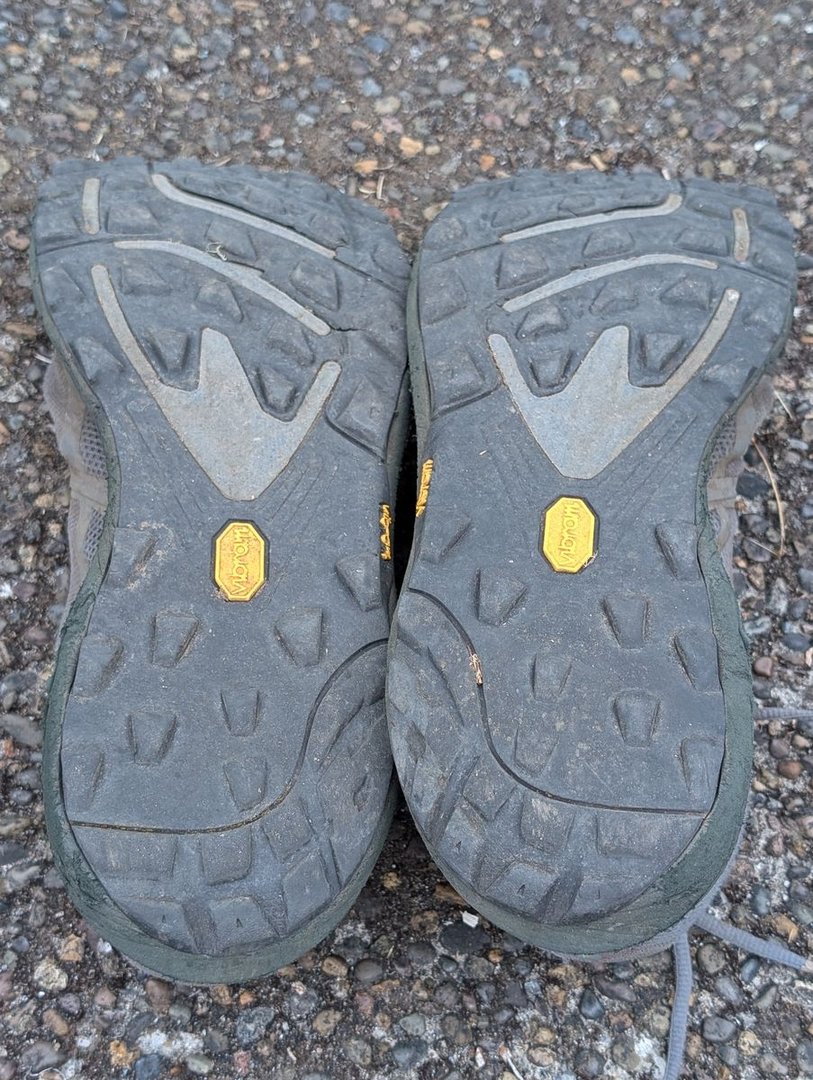 • Ich (100 kg ohne Rucksack) habe jetzt Topo Terraventure 4 getragen, in der gleichen Größe wie vorher der 3, aber mit der neuen "Wide"-Option, und bin begeistert. Passt mir hervorragend. Nach 530 Meilen (850 km) haben sie ihren Dienst getan, erste kleine Löcher im Obermaterial, weniger Dämpfung, Sohle intakt aber Profil schon deutlich abgenutzt.