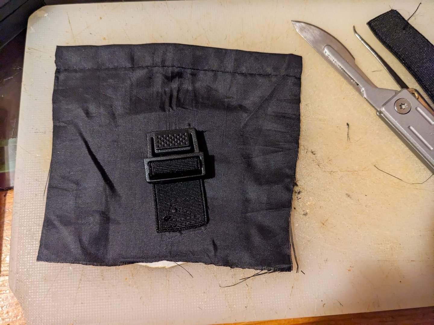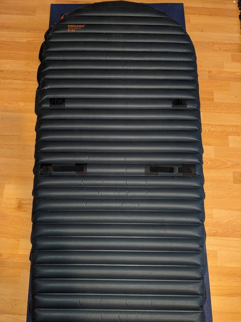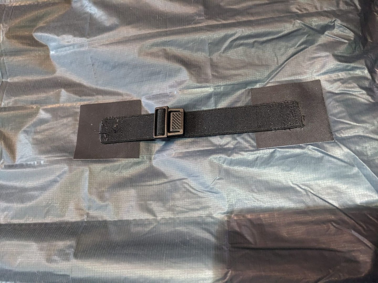 Dafür habe ich die Original-Straps auseinandergeschnitten, und jeweils einen 14 cm langen Teil verödet. Diesen habe ich auf ein Stück Polyester genäht, dann die Schnalle eingefädelt, und das andere Ende auf ein weiteres Stück Polyester genäht. Dann unter beide Polyester-Stücke ein Stück doppelseitiges Klebeband geklebt, und schlussendlich mit dem Cutter in die endgültige Form gebracht. Und dann entsprechend auf die Iso-Matte (Uberlite W) aufgeklebt. Zum testen hatte ich nur aus einem Gurt Pads gebastelt.