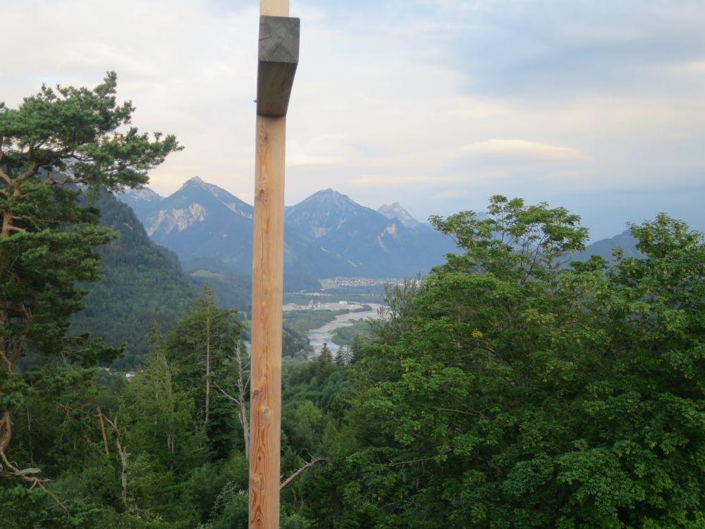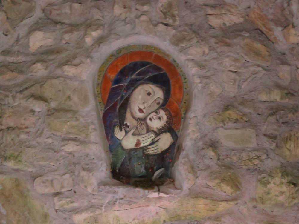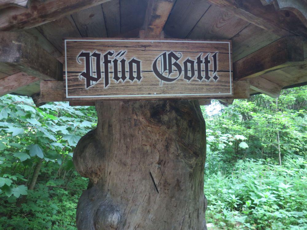 an einer trekkingzeltplatzzulassungsgeeigneten wiese das schlimme kreuz. solche wiesen seh ich in der gegend um gap später häufiger, auf ihnen ist vorbearbeitetes brennholz in maßen gelagert, deren namen ich nicht weiss. mir geht durch den theologisch kenntnisfreien kopf, das ist bestimmt das kreuz, das bedeutet, man bzw. frau soll kein sex haben, ausser mit dem herrn. vorm kreuz in stein gemeißelt ein meme von johannes, der moses zitiert, um dessen diskurs eine andere richtung zu geben. dahinter, in einer übermauerten kuhle, die der des wurzelsepp ähnlich ist und bestimmt auf vorchristliche einflüsse zurückgeht das einzige frauenbild des kreuzwegs.