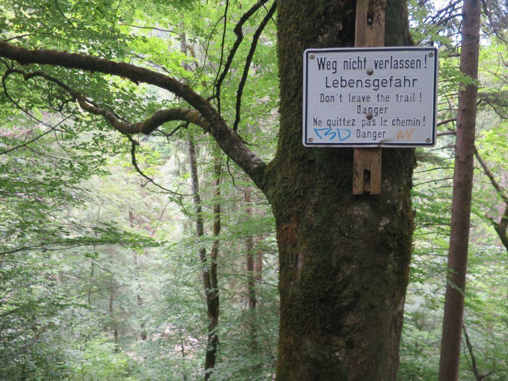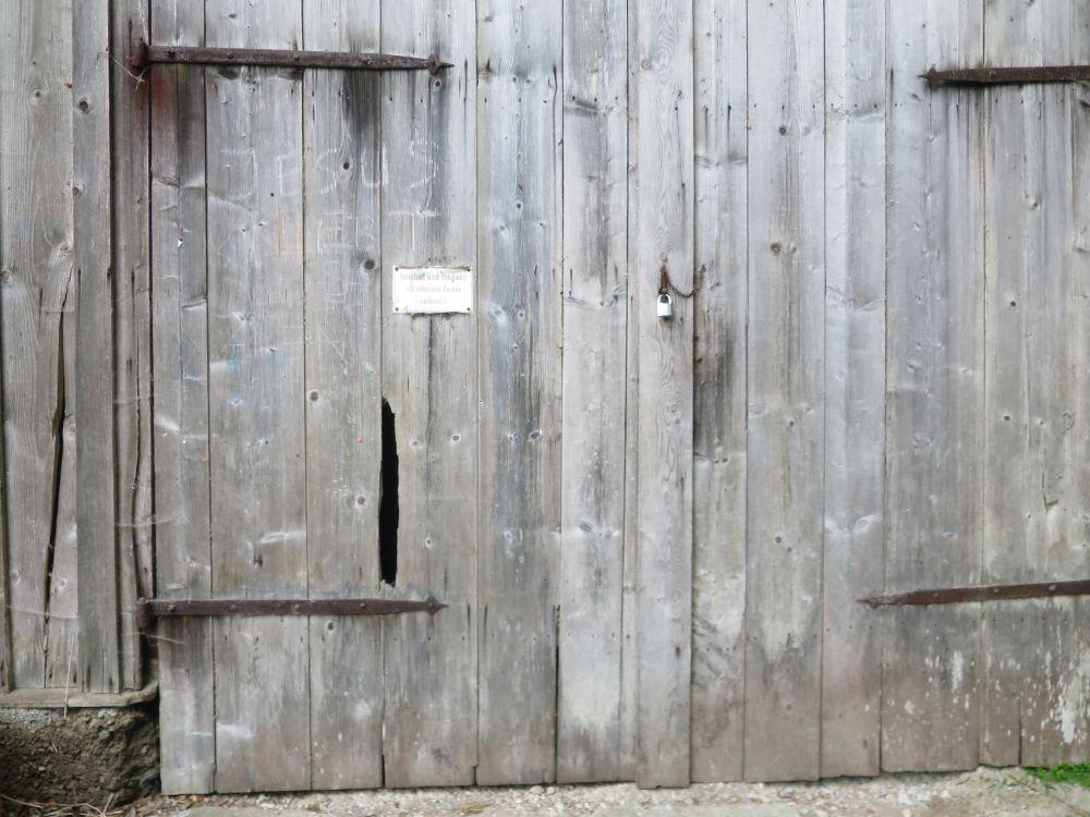 kunstvoll-dissidente aufschrift. scheune vor der pöllatschlucht. kurz nach sieben, niesel.