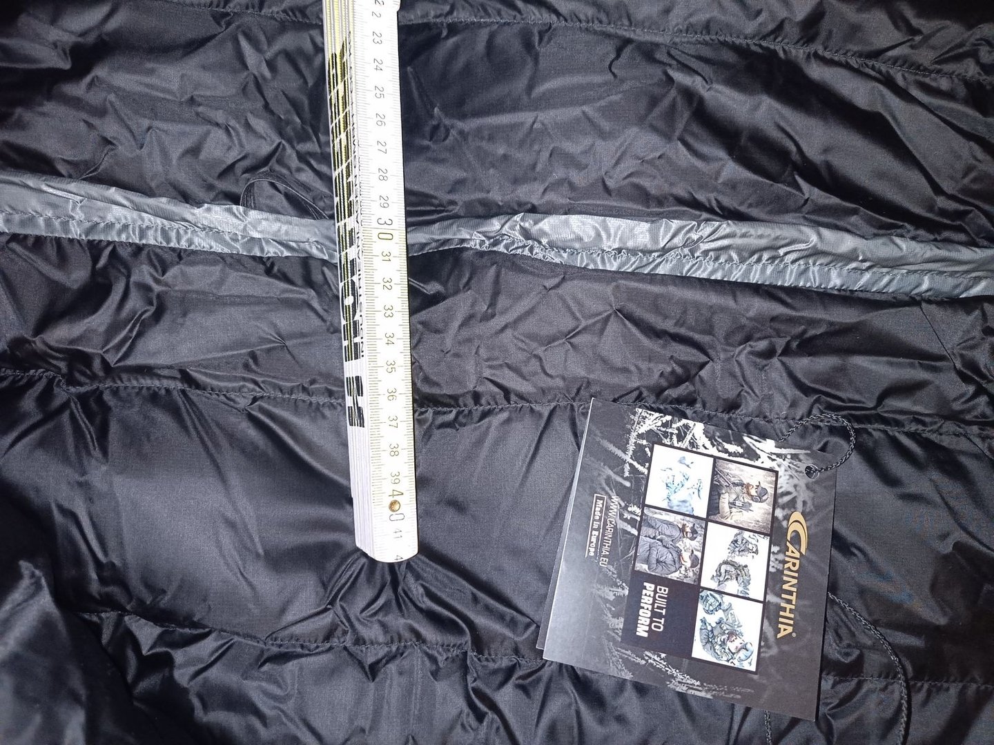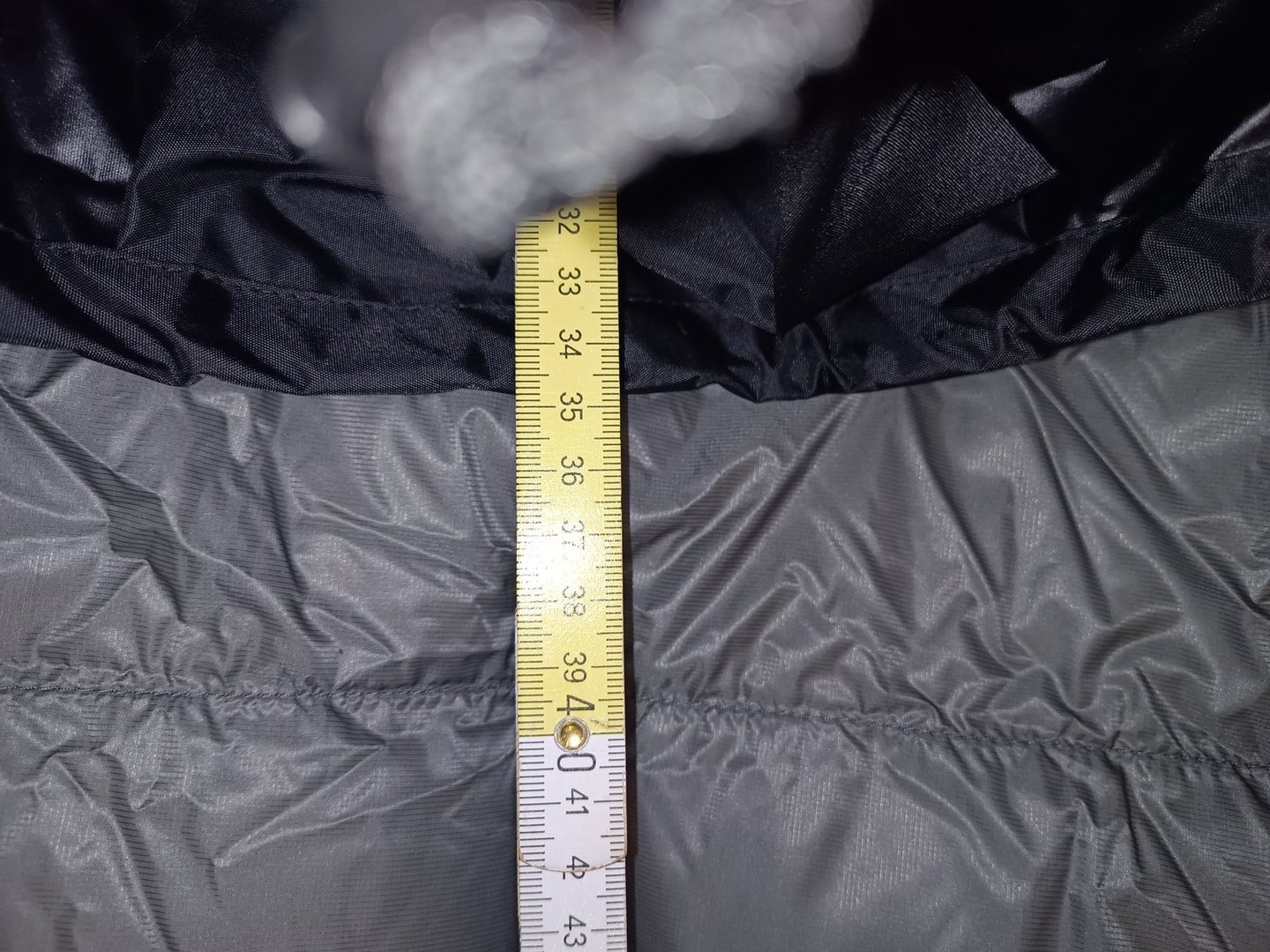 Die Länge habe ich dennoch gemessen, einmal von der liegenden Kapuze bis zum Wärmekragen und von diesem bis zur aufgestellten Fussbox:
