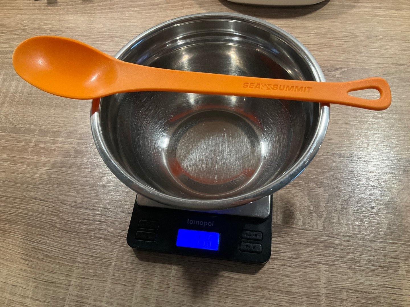 Tactical black, 14 g. Zum Vergleich ein handelsüblicher Titanlöffel von boundless voyage. Der wiegt mehr...
