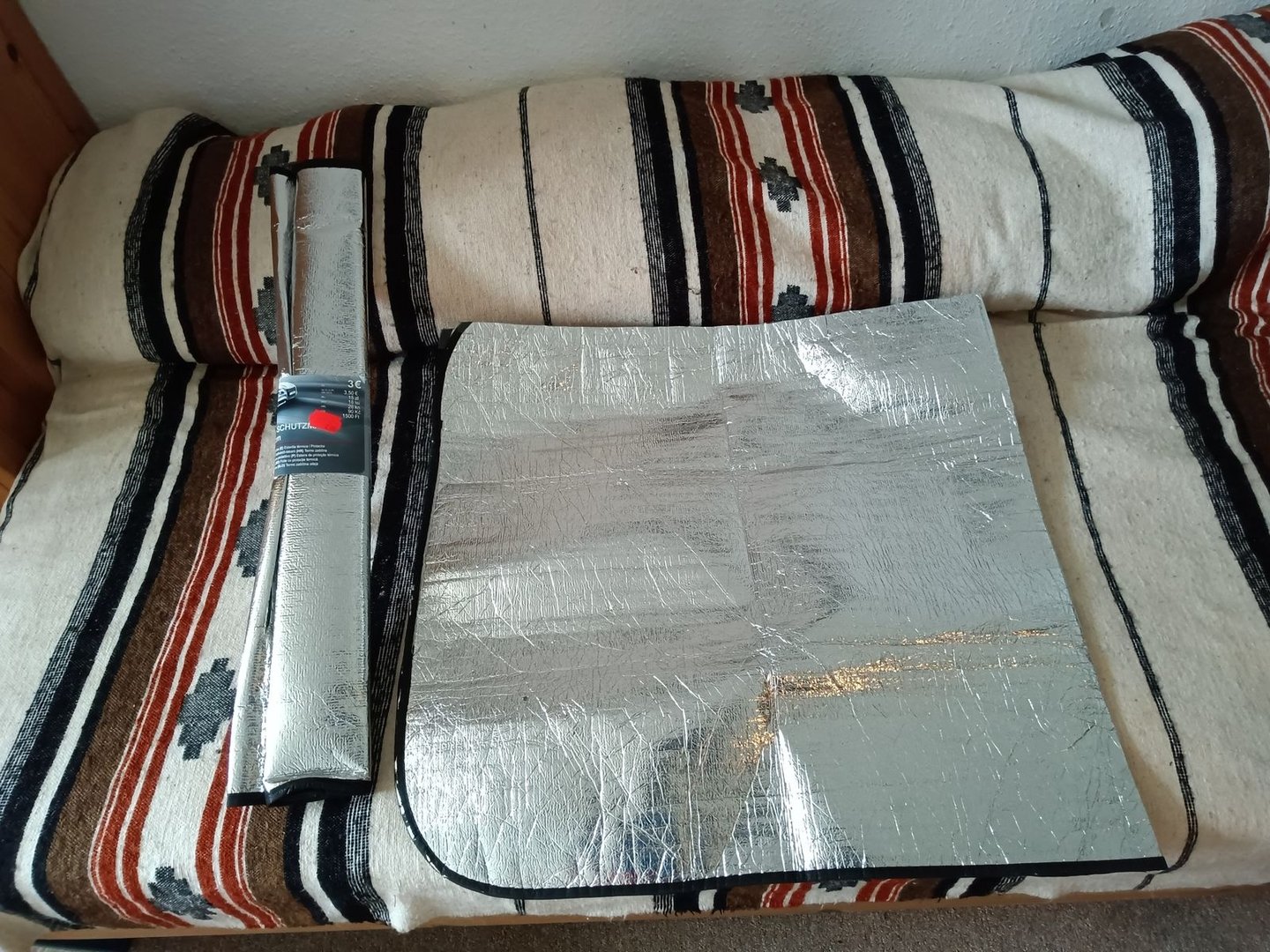 Wiegt 30 g (am Rand mit Paketklebeband versträrkt) , ist megagünstig (s. Preisschild) , und ist unterwegs mein Sitzkissen bei Pausen gegen nassen/kalten Arsch. Doppelt ist die noch 70 x 50 cm und reicht auch im Winter zum Draufsetzen. Außerdem ist dieser "Silbersitz" mein Rückenpolster im Rucksack. Multi-Use und KISS.