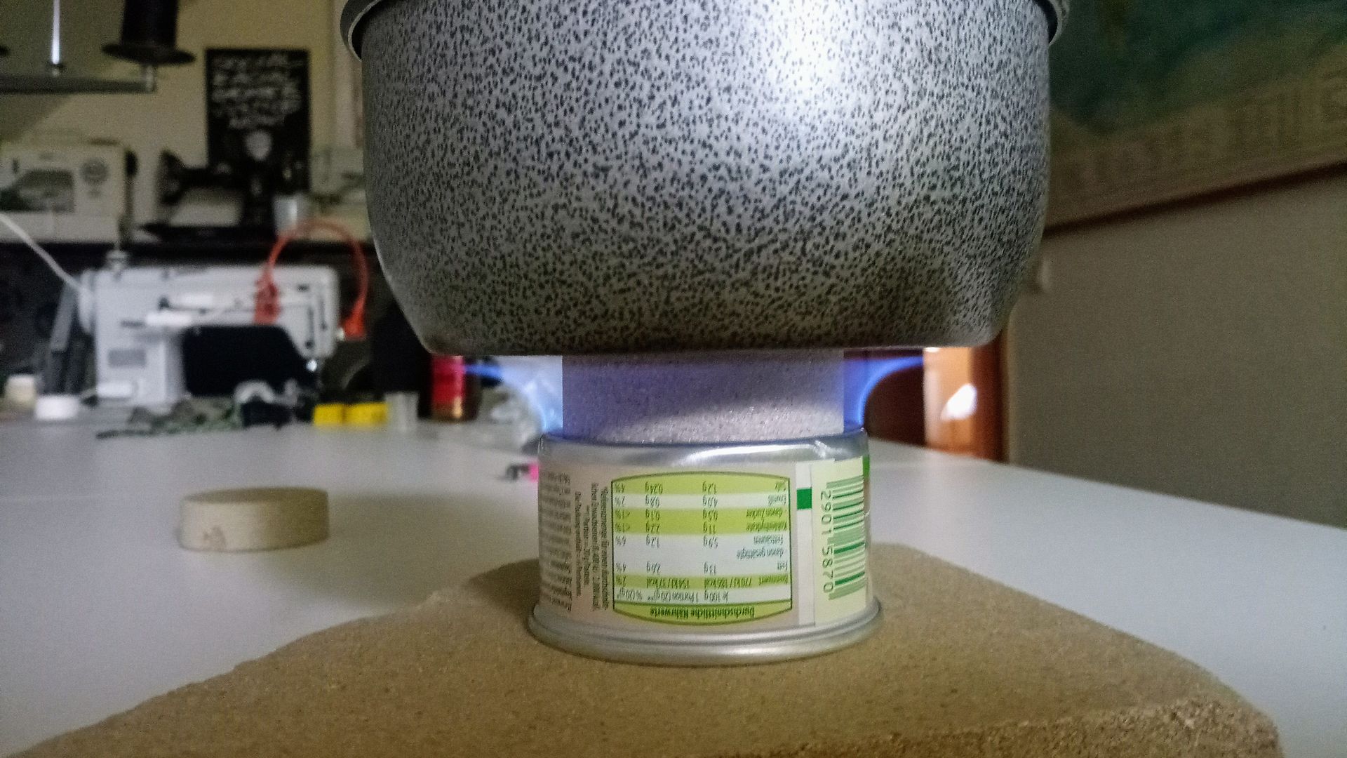 Den Stein habe ich in einer passenden dichten Dose mit der Menge Spiritus vollsaugen lassen, die ich sonst auch immer benötige, um 500ml zum Kochen zu bringen und um es ein paar Minuten köcheln zu lassen (ca. 20ml). Nach etwa 10 Minuten habe ich den Stein dann auf die umgedrehte Dose gelegt (um sicheren Abstand zum Boden zu haben), den gefüllten Topf direkt darauf gestellt und angezündet.