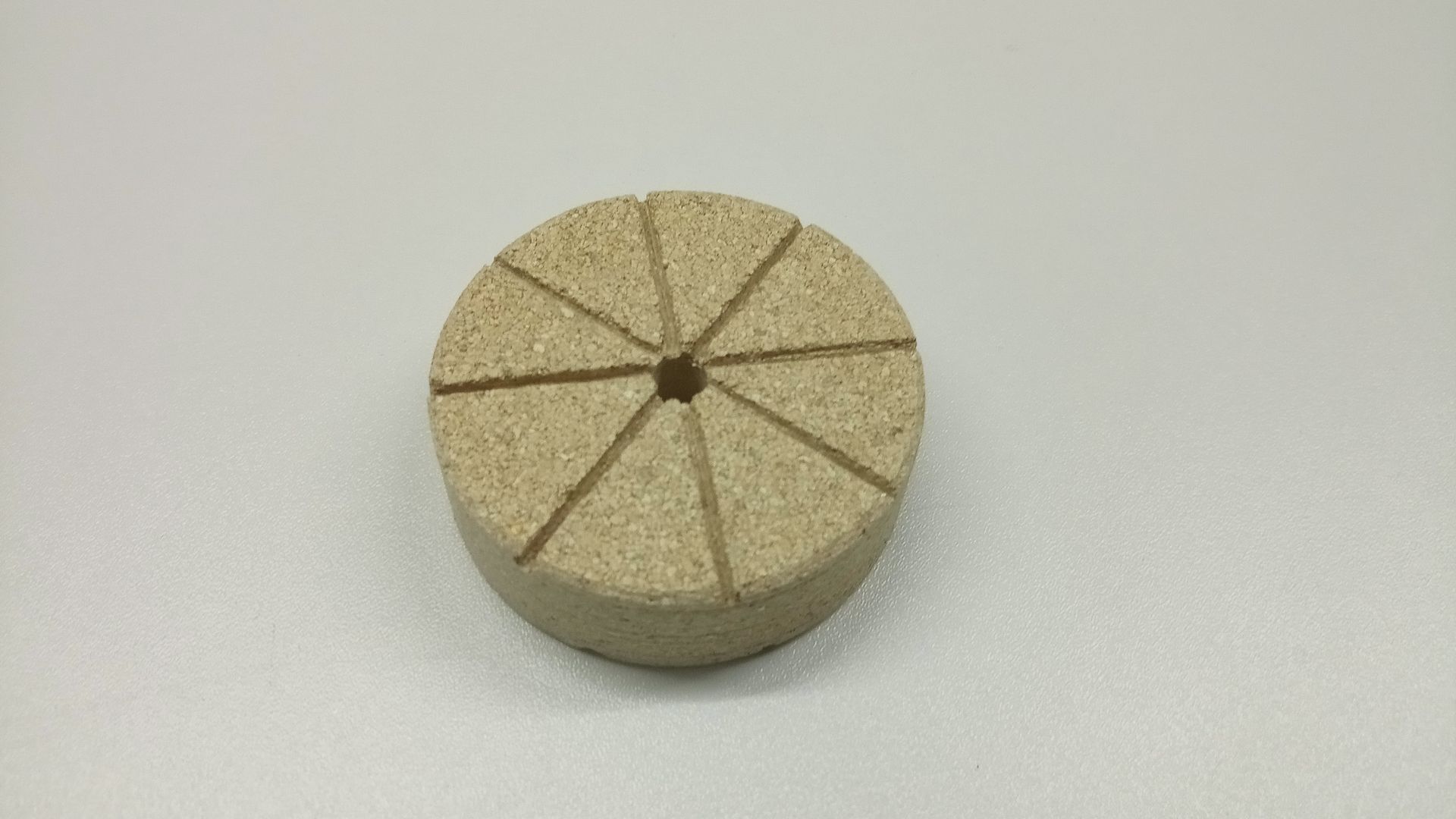 Daraufhin säge ich in die Ober- und Unterseite der Scheibe einige Rillen, damit der Spiritus einfacher nach außen dringt.