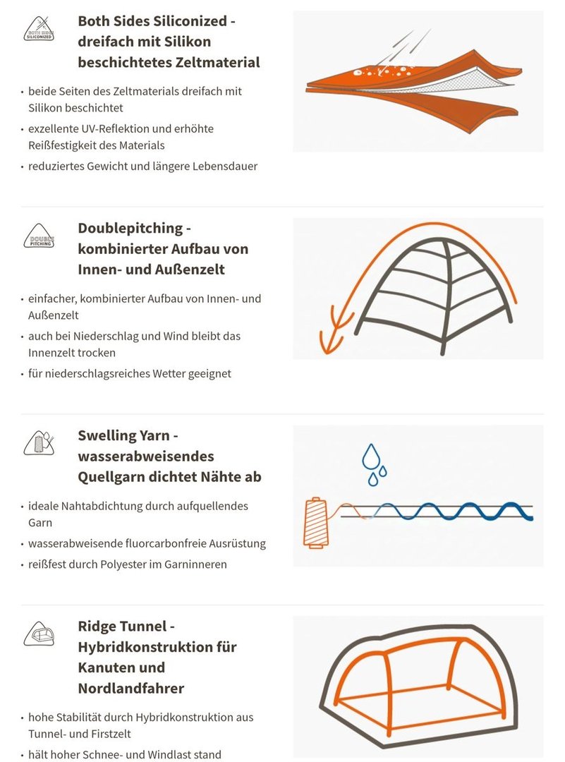 Vaude: „… beide Seiten des Zeltmaterials dreifach mit Silikon beschichtet“