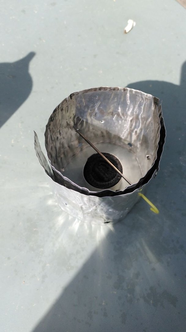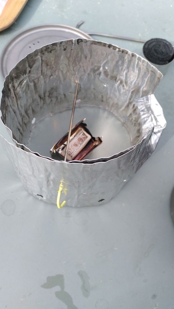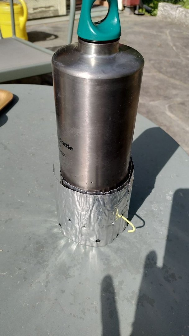 • Für Plastikvermeider im Flaschenbereich bieten sich Titanflaschen (Edelstahl geht natürlich auch) an. Das Mehrgewicht (meine 0,8l Flasche von Evernew wiegt 109g mit Verschluss) lässt sich aber etwas relativieren, wenn die Titanflasche mehrfach eingesetzt wird - als Trinkflasche, als Wärmeflasche und als Kochflasche. Als Topfhalter dient mir dafür der gekürzte Alu-Faltwindschutz vom Whiteboxstove, den ich mit mehreren Löchern und einem herunterklappbaren Schlitz für den Topfgriff versehen habe, so dass dieser für mehrere Topfgrößen und eben auch für die Titanflasche passt, es reicht sogar jeweils ein Hering als Halter. Betrieben wird das Ganze entweder mit einem Teelicht-Carbonbrenner oder auch mit Esbit. Gewicht Windschutz (ohne Hering) 18g, Teelichtbrenner 4g. Um die heiße Flasche noch anfassen zu können, verwende ich derzeit noch ein flexibles Wollband, bin da aber noch an einer Multi-Use-Lösung.