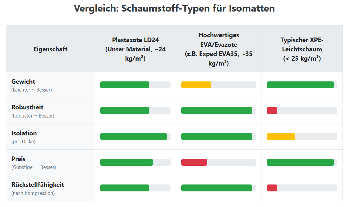 Es kombiniert ein sehr geringes Gewicht (ca. 30% leichter als typisches EVA/Evazote mit ~35 kg/m³) mit hervorragender Isolation. Unsere Labormessungen für das verwendete Plastazote (k ≈ 0,0371 W/mK) ergeben rechnerische ASTM R-Werte (USA) von ca. 0.61 4mm) und ca. 1.22 (8mm). Im Vergleich dazu liegt der rechnerische R-Wert für typisches EVA/Evazote mit ~35 kg/m³ Dichte (k ≈ 0,0379 W/mK) bei ca. 0.6 (4mm) und ca. 1.20 (8mm). Plastazote® bietet also eine mindestens ebenbürtige, tendenziell sogar leicht höhere Isolationsleistung als bekannte Evazote-Matten – aber bei deutlich geringerem Gewicht. Bei der Robustheit positioniert sich Plastazote® im Spektrum leichter Schäume als guter Kompromiss: Es ist ca. doppelt so haltbar und reißfester als die sehr empfindlichen, aber extrem leichten XPE-Schäume. Gleichzeitig erreicht es nicht die Abriebfestigkeit von deutlich schwererem EVA/Evazote. Es ist ideal für alle, die bewusst mit ihrer Ausrüstung umgehen. Wichtiger Hinweis: Es ist kein primärer Durchstichschutz; ein sauberer Untergrund (ohne Dornen, spitze Steine) wird weiterhin empfohlen.
