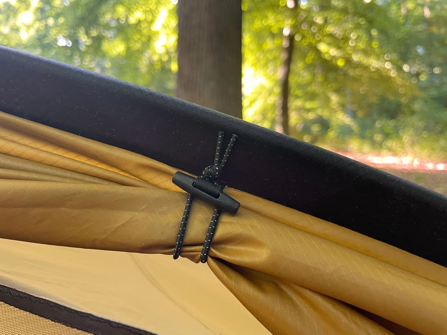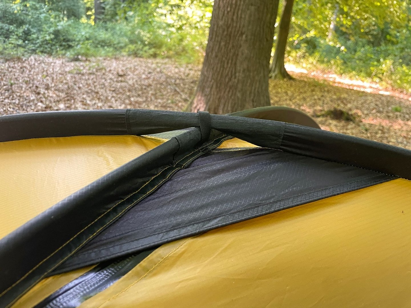 Das Problem wurde schlimmer, je länger die Stangen wurden. Also die Spannung ist dann im oberen Teil sehr stark, aber die Gestängeenden ziehen sich quasi Richtung Zeltmitte. Dadurch verliert der Saum komplett an Spannung. Ich muss zugeben, dass ich echt nicht verstanden habe, warum sich Clips da so anders verhalten.