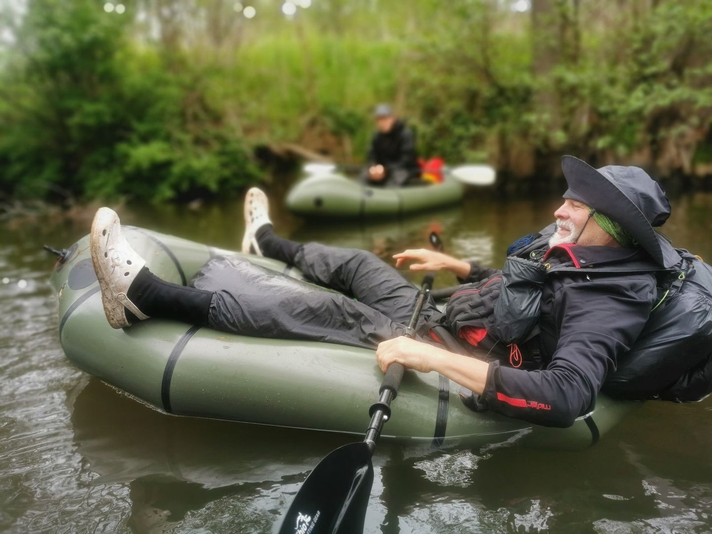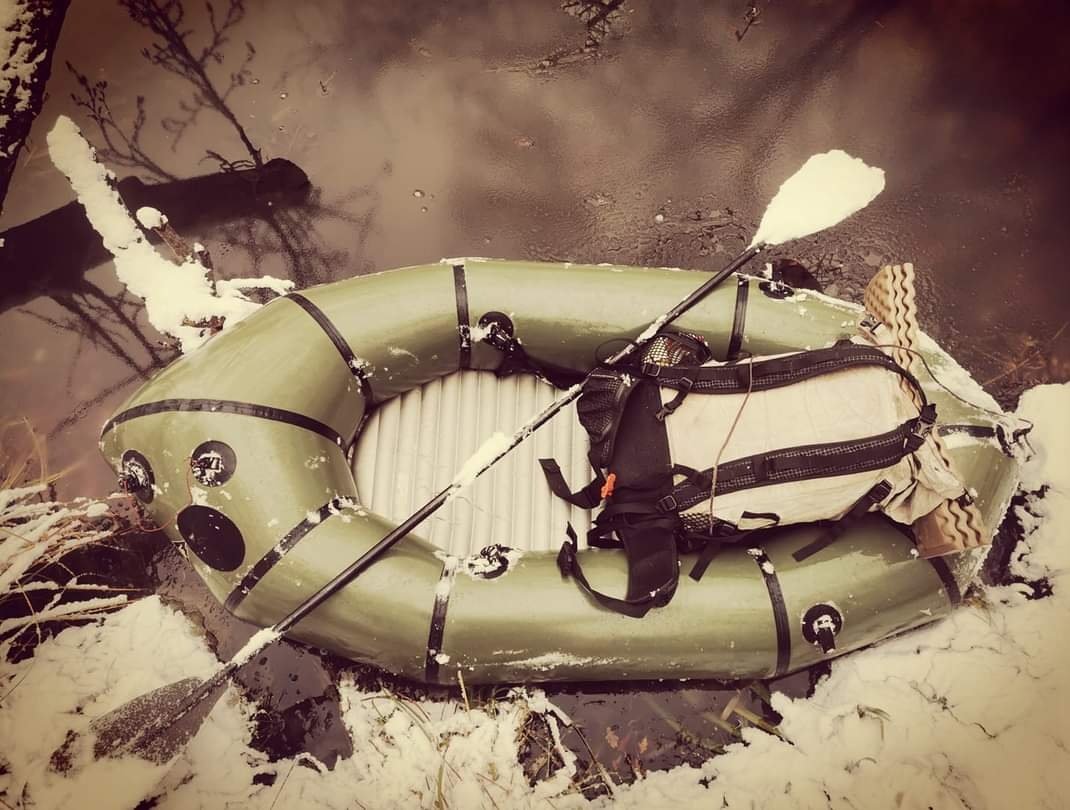 Auf dem umgedrehten Packraft schlafen, Paddel als Tarpstange oder fürs Mid.