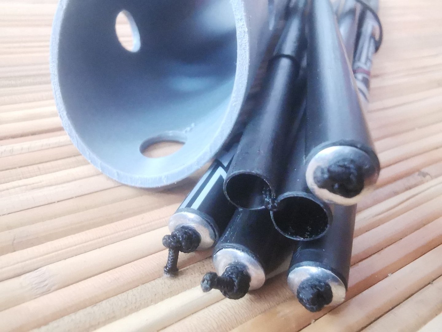 Da ich die kaufbaren zwar interessant finde, aber selber basteln durchaus denkbar war, habe ich mich für das letztere entschieden. Die Stangen sind Carbon Pfeilschäfte in 2 Durchmessern, um Teilungen für ein kompaktes Transportmaß zu bekommen.