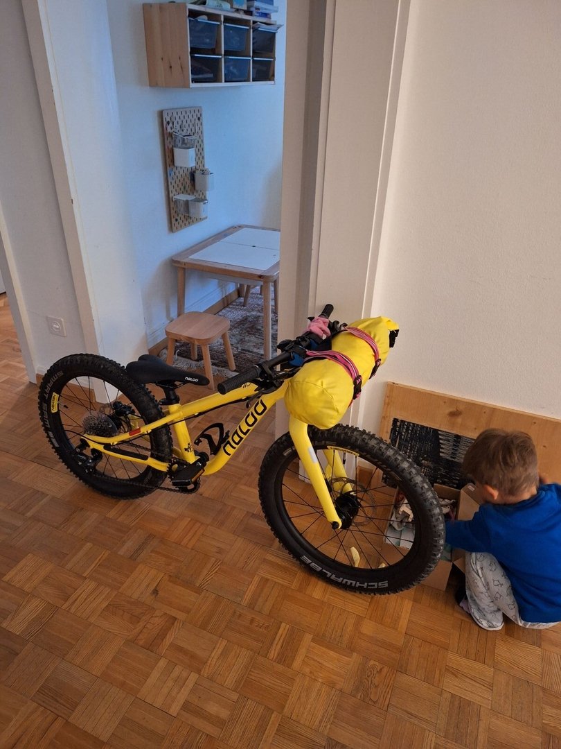 Hahahahaha, das gelbe Kindermountainbike, mit farblich passender Rolle vorm Lenker, ist ja absolut niedlich!