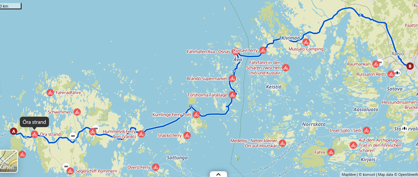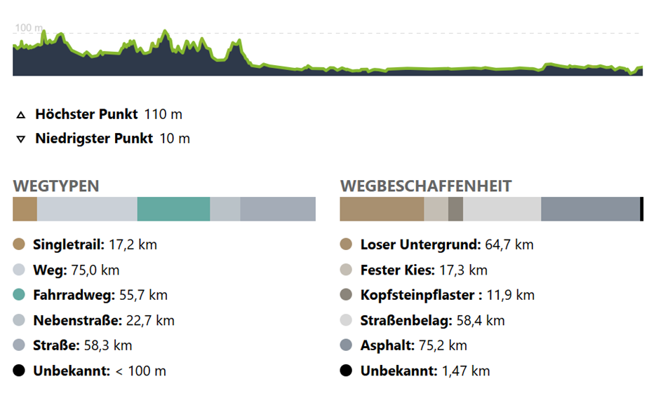 Ich hatte auf dem Fahrrad-Navi 2 Routen, einmal die, die weitgehend dem Originalweg folgte und eine mit höherem Radweganteil. Meistens sind wir den Originalweg gefahren, wenn größere Strecken zurückzulegen waren oder die Gegend etwas langweiliger war: Radwege.