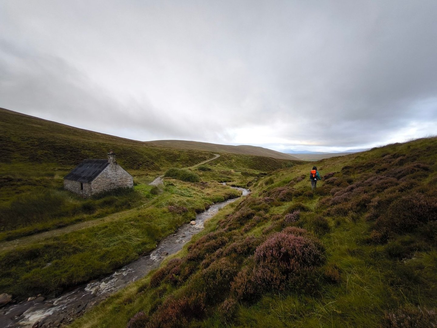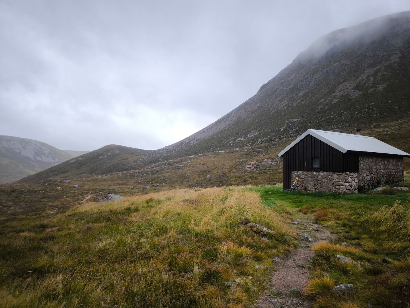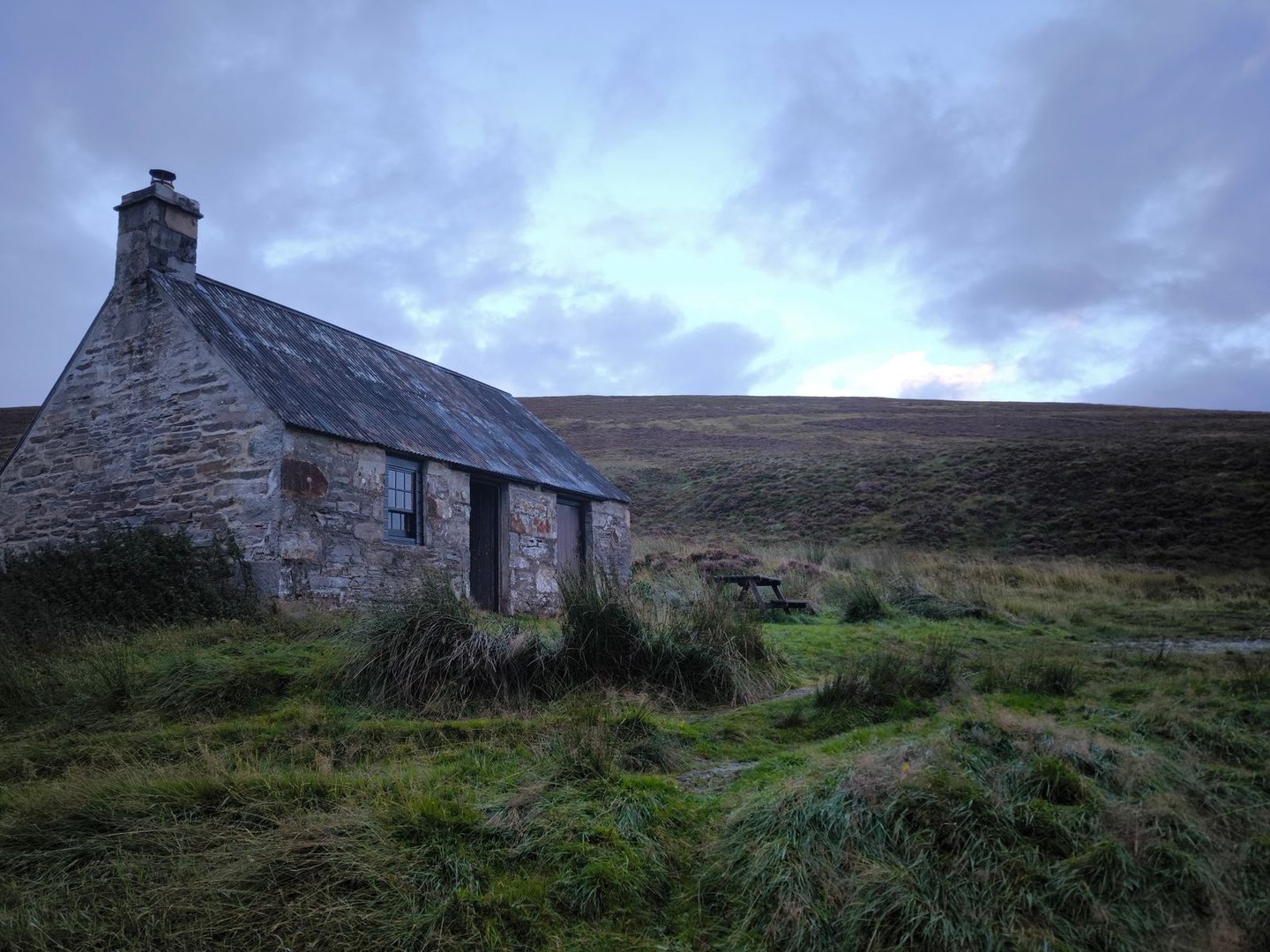 Der restliche Weg war dann geprägt von immer neuen und tieferen Blicken in die weite Landschaft, bis wir schließlich die Bothy erreichten, die tief in einem Einschnitt liegt, wodurch man sie erst sehr spät sieht. Da kurz vor dem Erreichen unseres Tagesziels Regen einsetzte, haben wir es uns dann auch direkt in der kleinen Hütte gemütlich gemacht.
