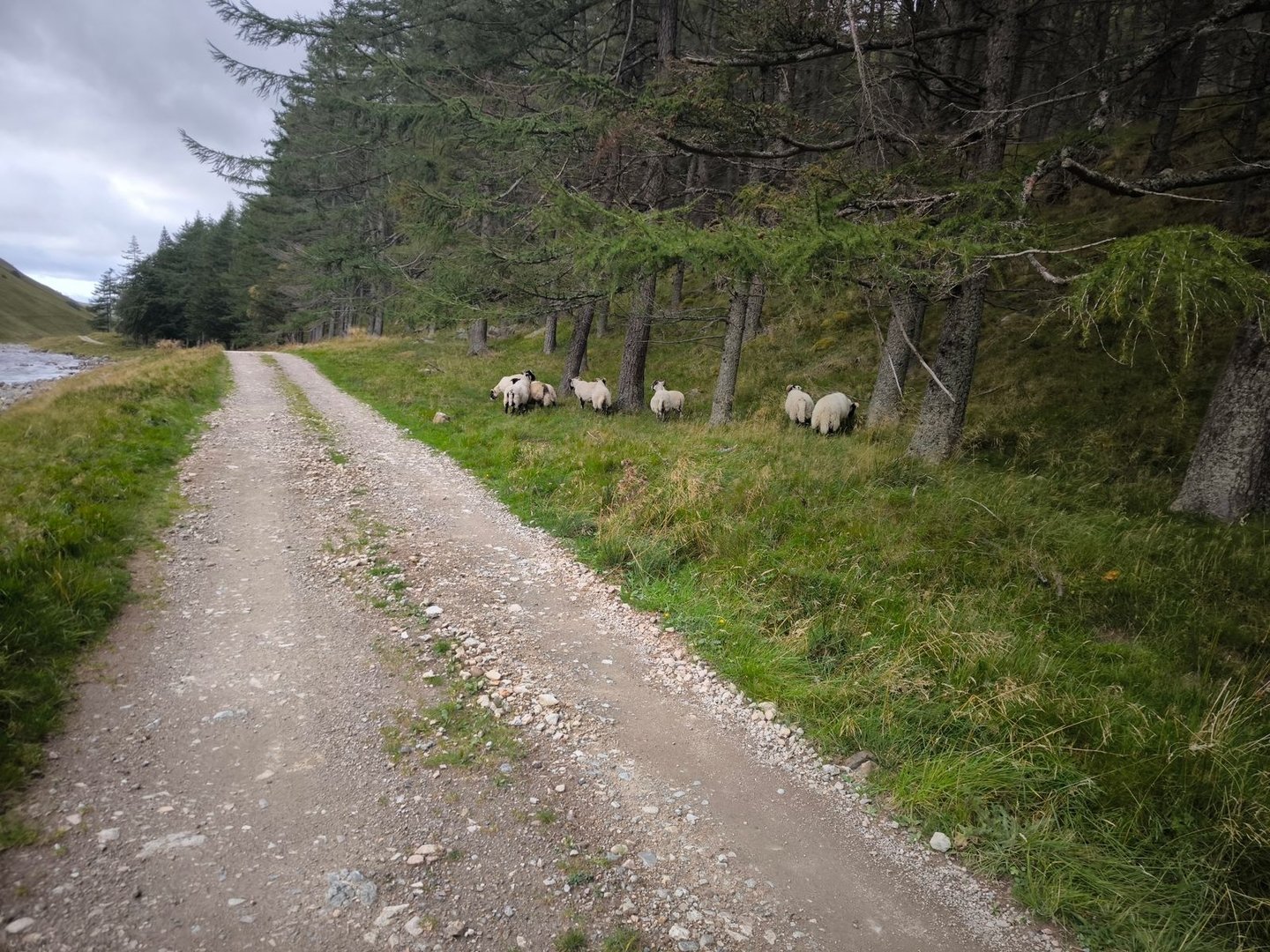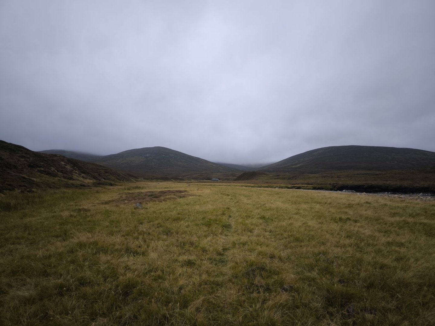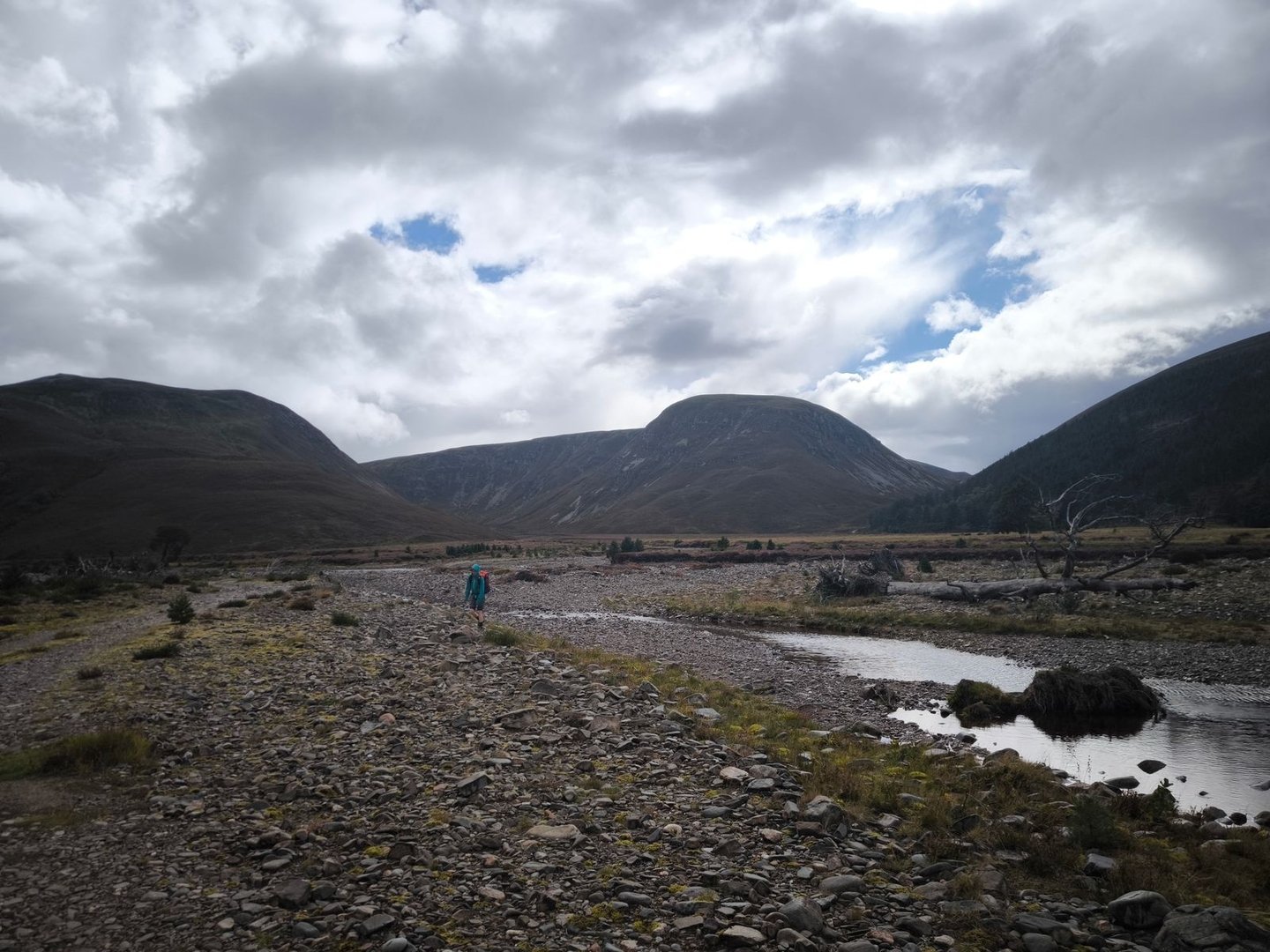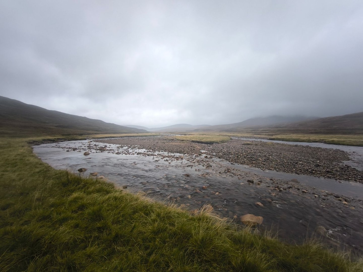Der Weg war weiterhin äußerst feucht, aber lange Zeit gut mit Steinhaufen markiert – bis er es dann nicht mehr war und wir uns einige Kilometer durch sumpfige Wiesen mit tiefen nicht immer gut sichtbaren Einschnitten schlagen mussten (und ich fast auf eine Schlange getreten wäre) Danach ging es dann wieder auf einer Gravel-Straße über die nächste Höhe hinunter ins Glen Feshie, wo uns (wie wir zu diesem Zeitpunkt noch nicht wussten) ein äußerst zahmer River Feshie für unsere erste größere Überquerung erwartete.