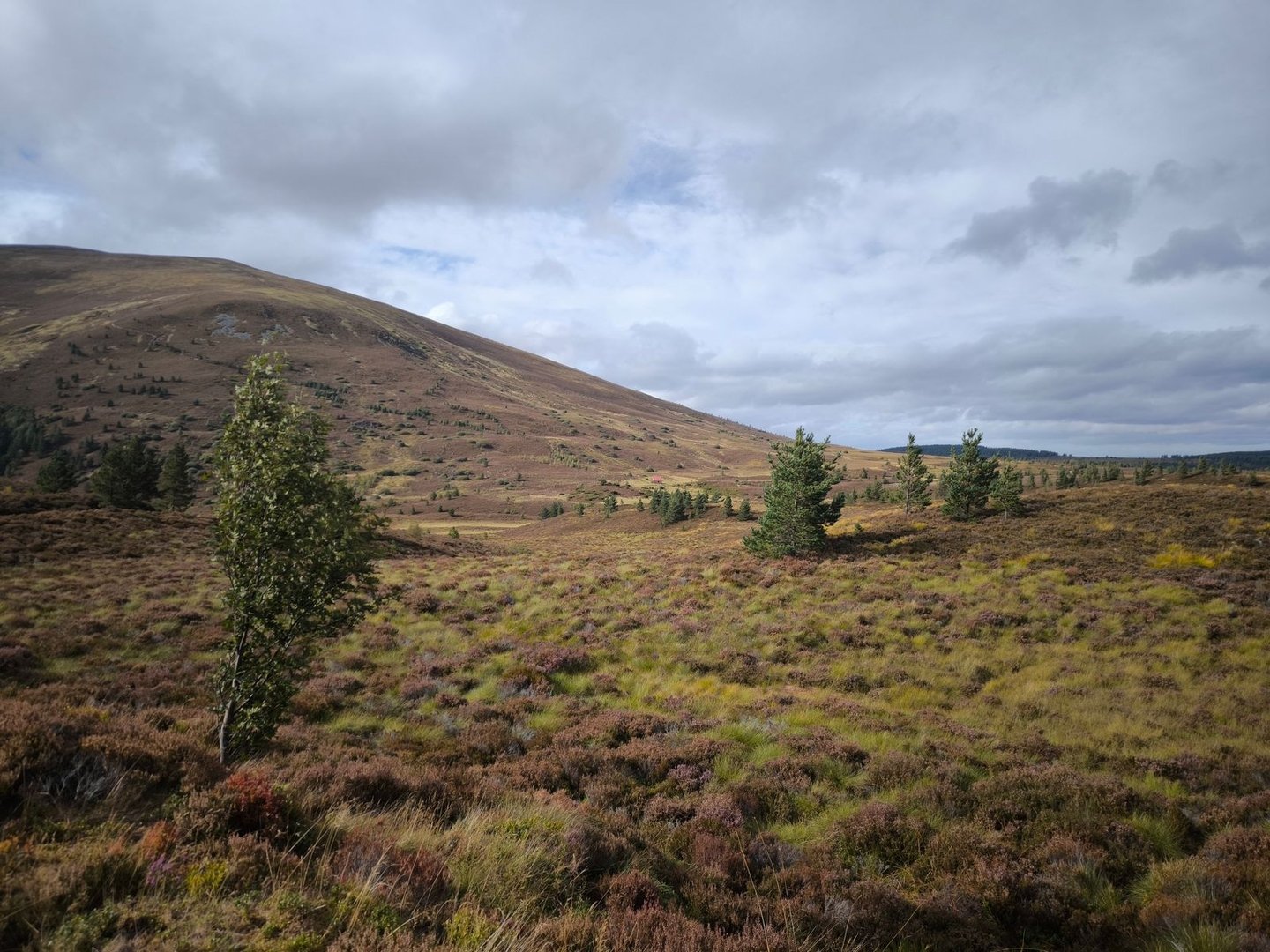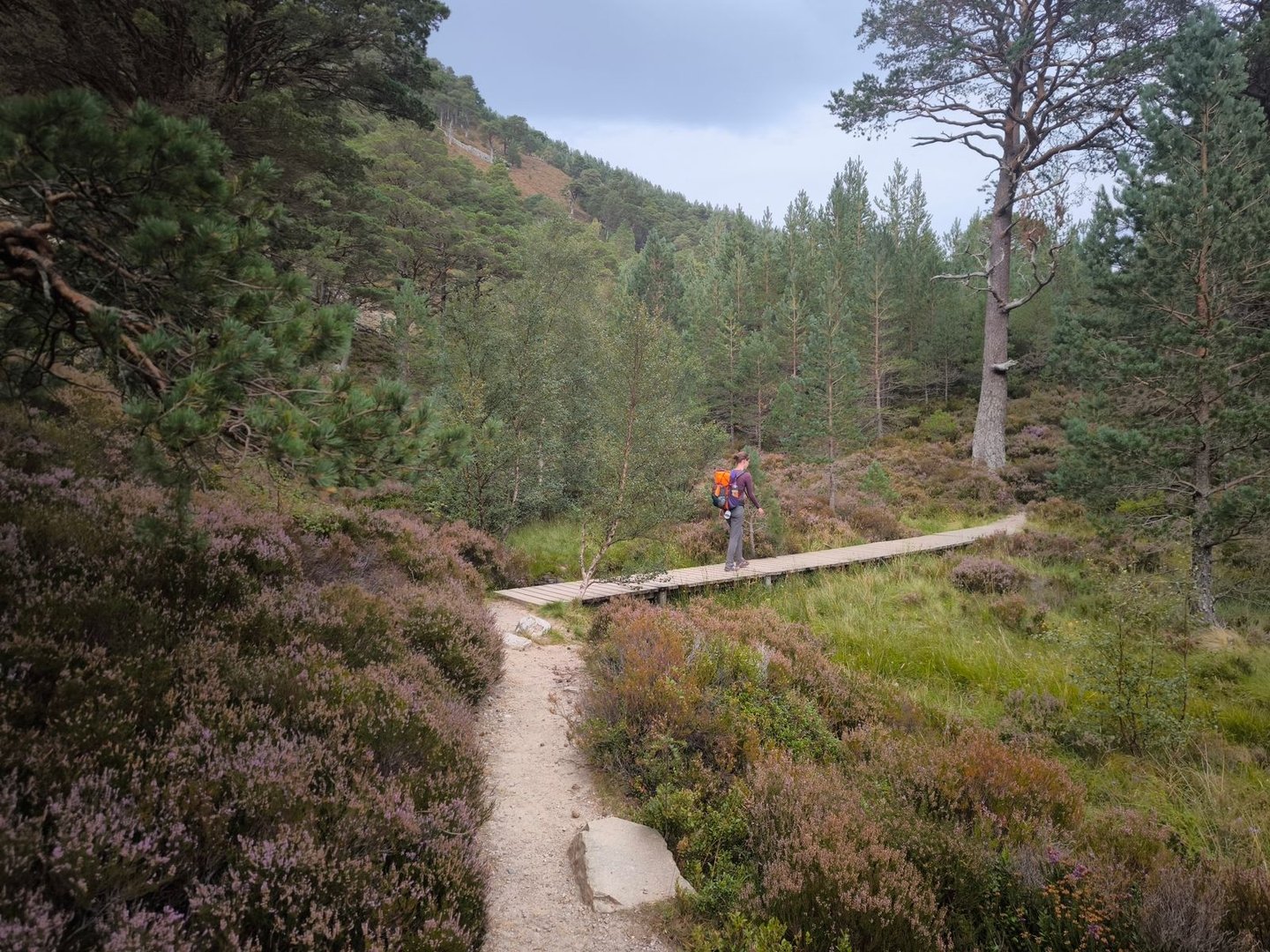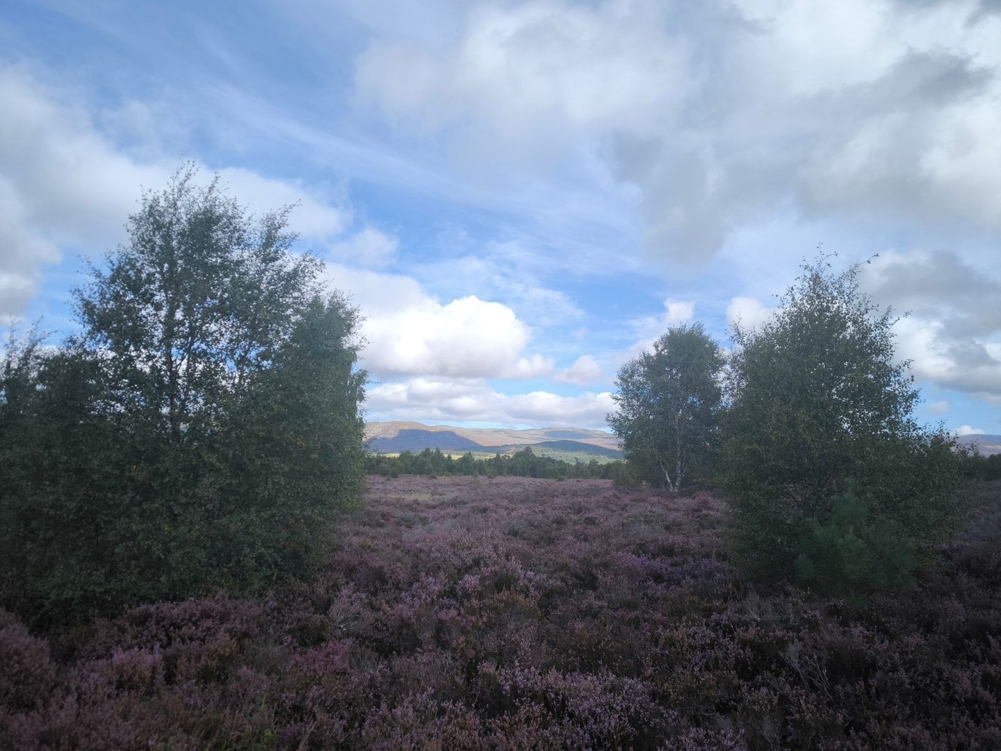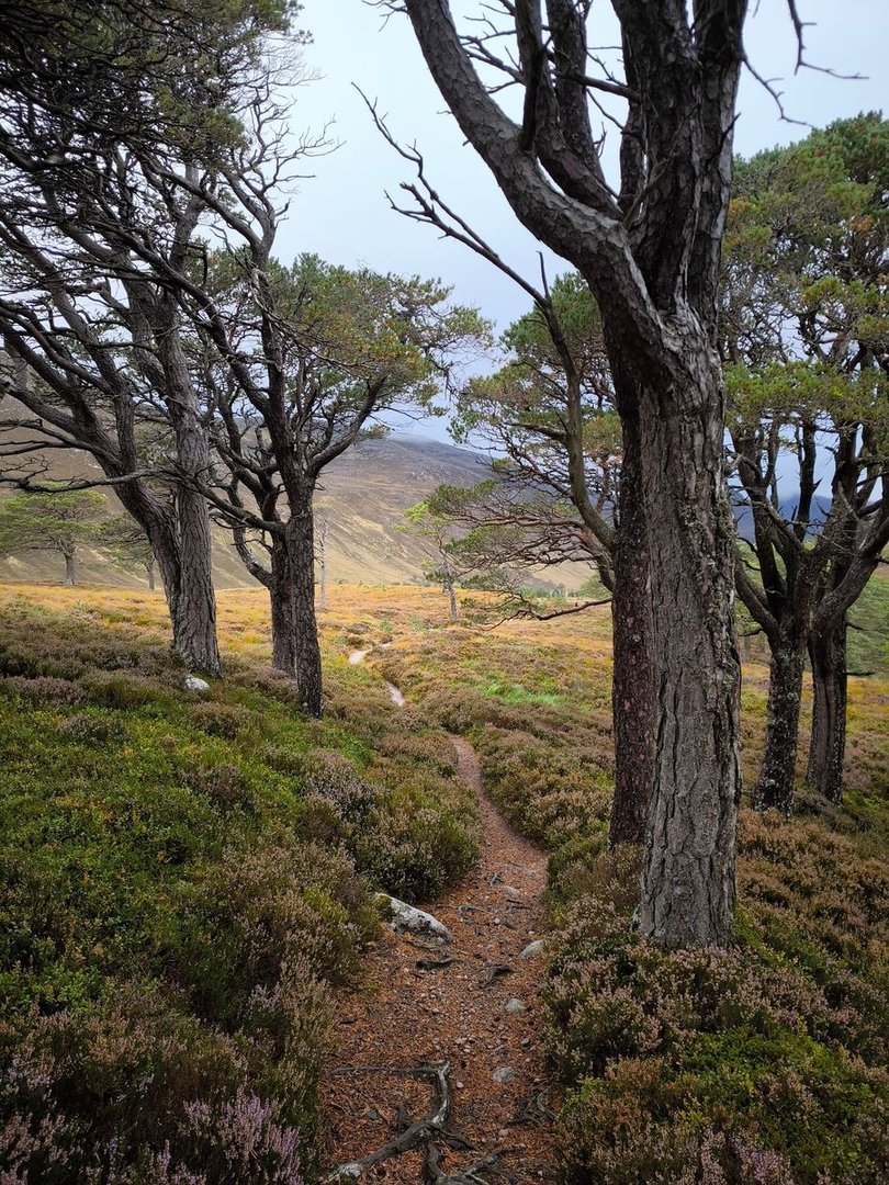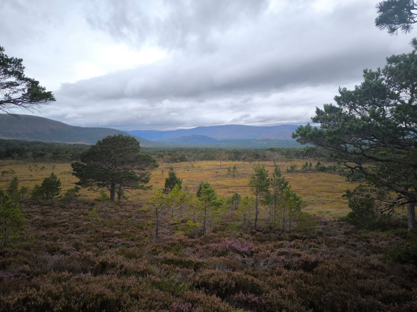 Gleich nach dem Start ging es durch eine wunderschöne Heidelandschaft mit vielen jungen Birken und Kiefern vorbei an einer Station zur Vogelbeobachtung mit einem weiten Blick über ein Feuchtgebiet (also noch leicht feuchter als der Rest der Cairngorms 😀).